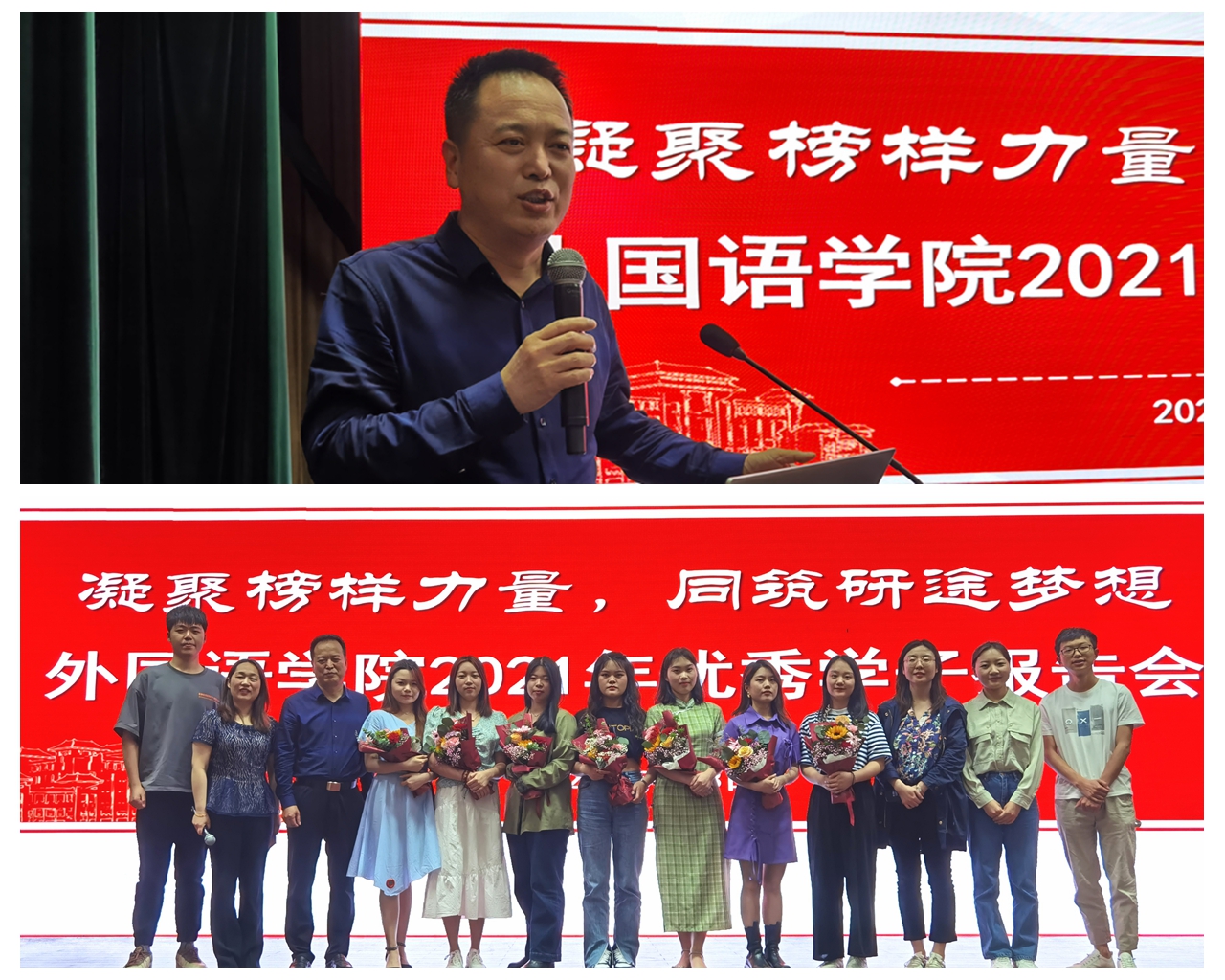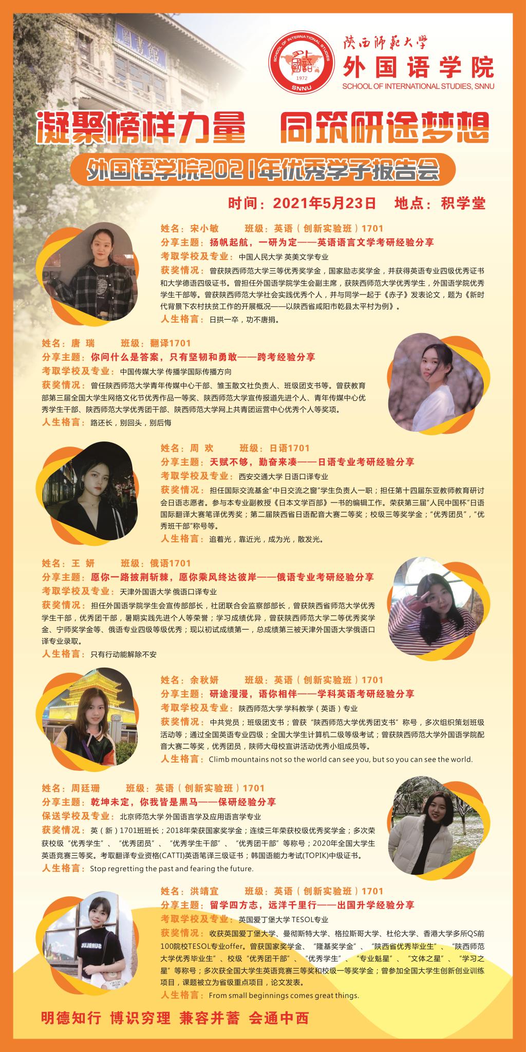 为促进太阳成集团tyc234cc朋辈引领,以优秀学子的榜样力量激励员工不断进步,太阳成集团tyc234cc于2021年5月23日下午四点半在太阳成集团tyc234cc雁塔校区积学堂举行“凝聚榜样力量,同筑研途梦想——2021年优秀学子报告会”。外国语公司党委书记董增云,2017级辅导员李丹,2018级辅导员曹钰林,2019级辅导员屈婉婷,2020级辅导员田毓霖、武瑞英以及公司全体非师范生参加了本次活动。报告会由外国语公司党委副书记鲁燕主持。
