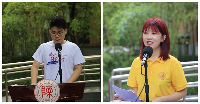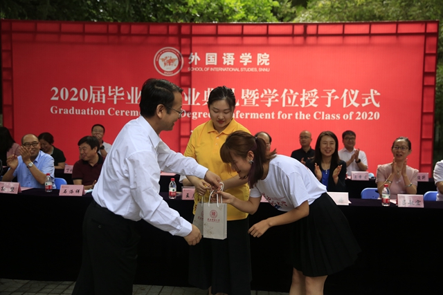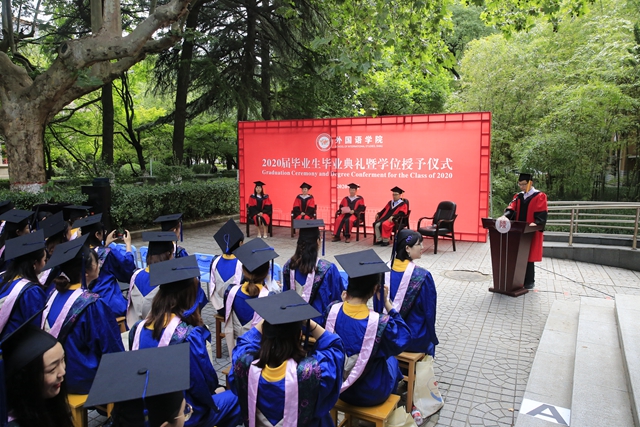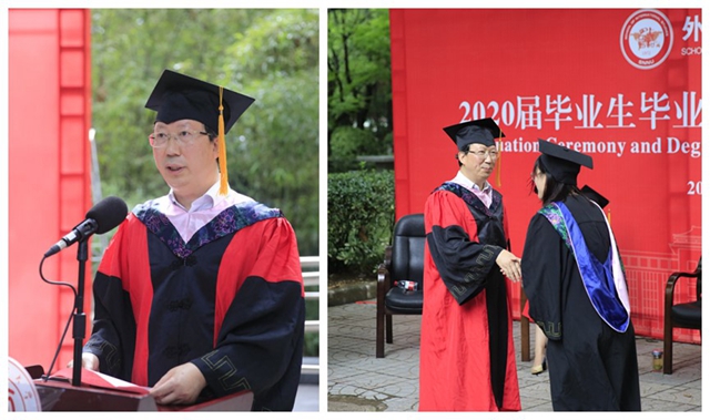 随后,本科生代表2016级翻译专业郭松硕同学发言,他表达了对老师、家长以及同窗的感谢之情,并深情地回忆了自己在校的四年时光,表示2020届毕业生将在祖国各地“发光发热”,为国家贡献自己的一份力量;2017级外国语言学及应用语言学专业的姜力丹代表全体研究生发言说到,本届毕业生将不忘初心,坚守信念,乘风破浪,直击沧海!