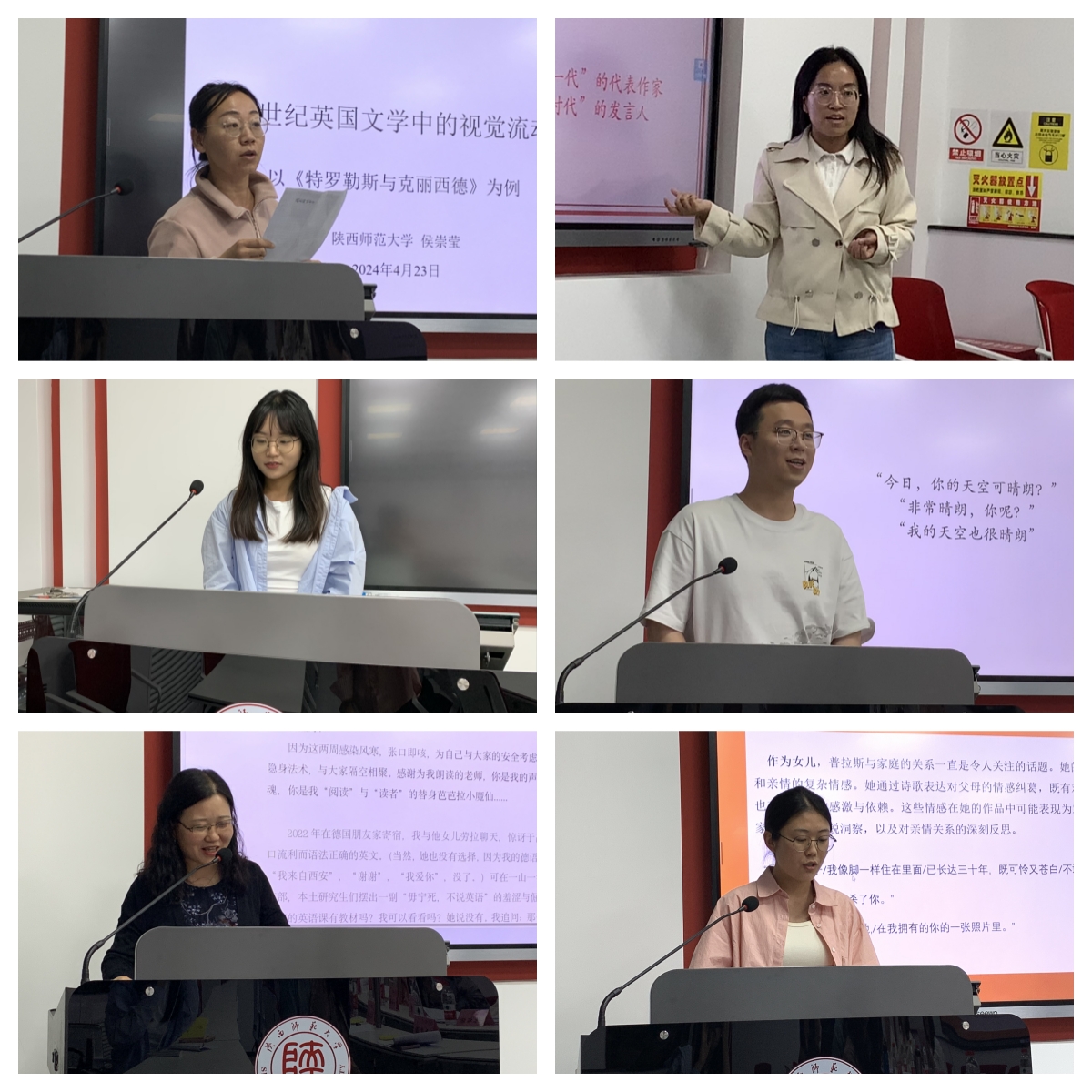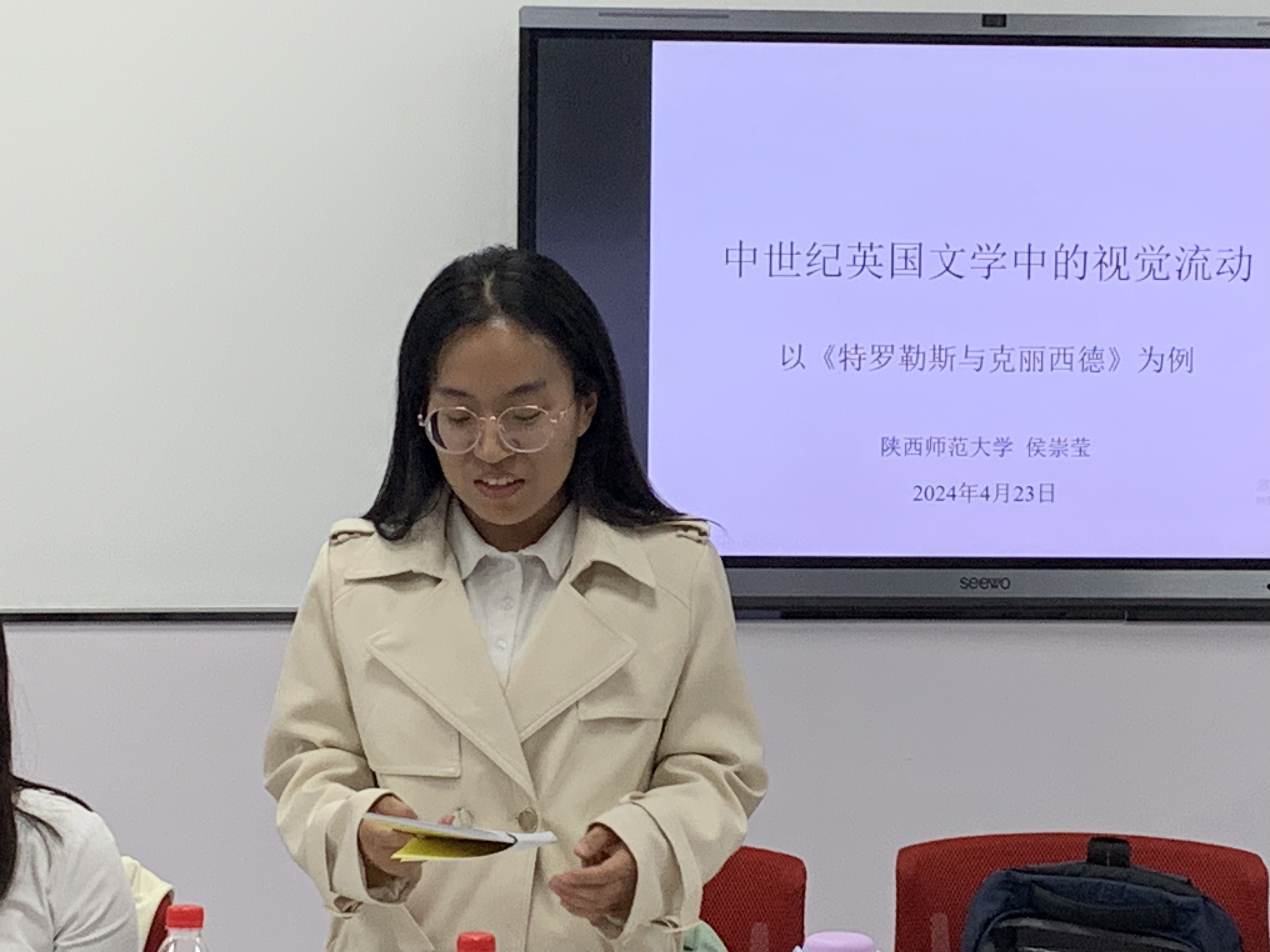 博士生侯崇莹以《特罗勒斯和克丽西德》为例,讲述中世纪英国文学中的视觉流动。硕士生降晓婷、刘靖梅和王浩杰分别对《了不起的盖茨比》中猫头鹰眼睛中年男人的意蕴、《我的安东尼亚》中女主人公的生存困境和《天真的人类学家》中作者自述的非洲经历进行了探析和解读。吴晶副教授梳理了仙侠小说国内研究现状与未来研究方向,探讨读者与阅读的关系。硕士生薛羽婷讲述了普拉斯诗歌中的自我身份流动性书写,探索其关于自我认知、情感表达和社会文化背景等更为广泛的意义。