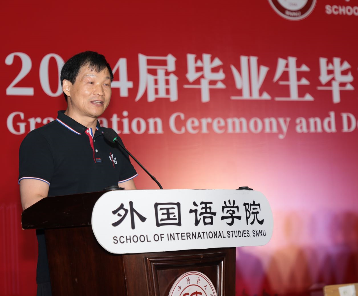 接着,外国语学外国语学经理刘全国教授讲话。他代表全体教职工送上对于毕业生最热烈的祝贺和最美好的祝福,祝福毕业生们话别这一段美好的人生旅程,开启下一段更加美好的未来征程。刘经理寄语毕业生在未来的人生道路中处理好三个关系:成功与失败的关系、Give和Get的关系、整体和细节的关系,并欢迎毕业生随时回母院聊天叙旧、加油充电。
