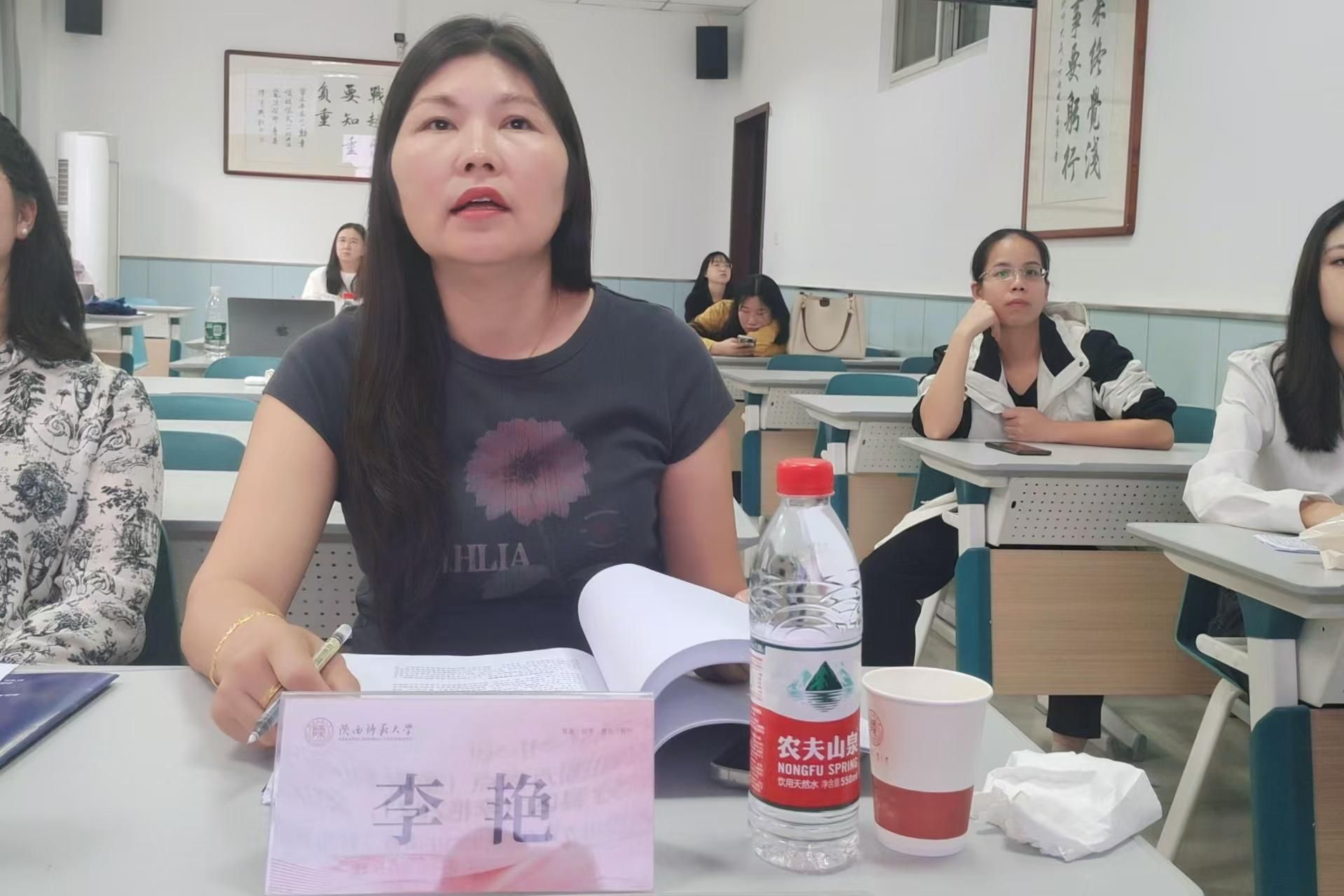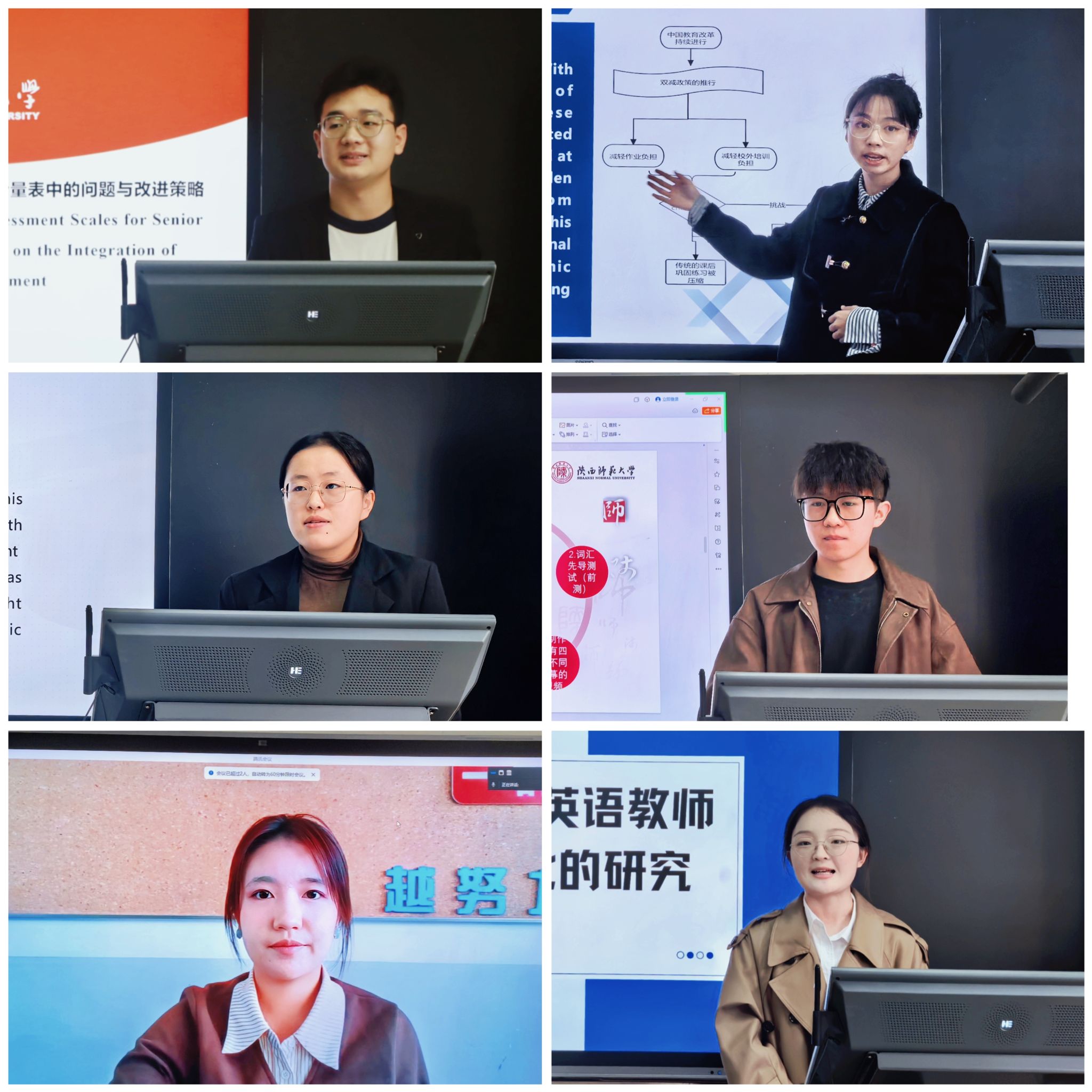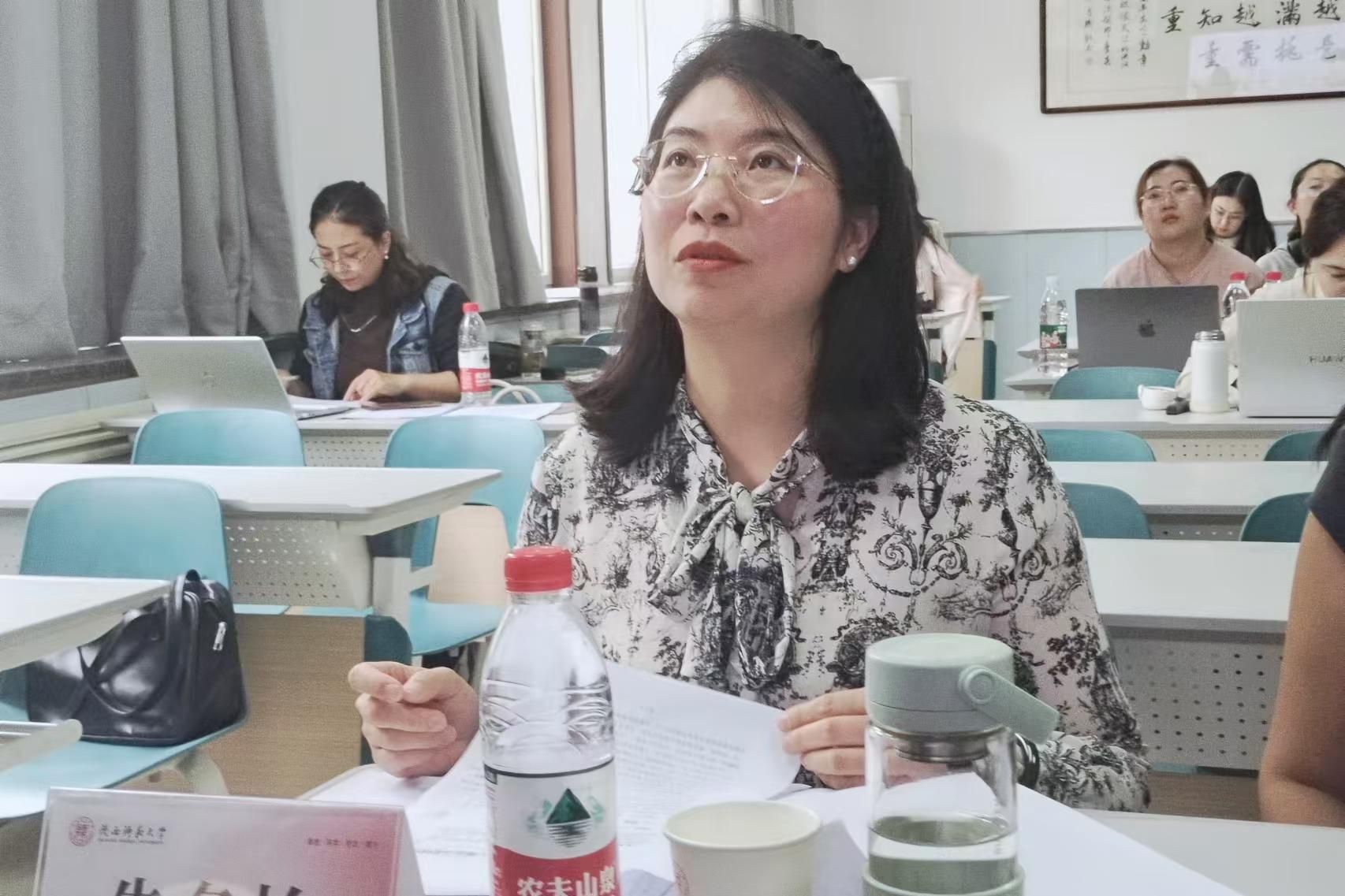 硕士生王艺超、程睿淇、张雨、周鹏羽、庞帅及韦誉君、李静萱、蔡雨暄、郭欣、郭雯雯、谢俊杰分别以“基于‘教一学一评’一体化的高中英语课堂教学评价量表中的问题与改进策略”“双减政策背景下初中英语作业设计研究”“内容依托式教学法对高中生批判性思维倾向的影响研究”“字幕类型对高中生附带词汇习得的影响研究”“职前英语教师反思能力发展研究”“实习期间职前英语教师身份认同变化的研究”“基于情境认知理论的高中英语深度阅读教学研究”“初中英语教师写作评价素养的个案研究”“PACE教学模式在初中英语语法教学中的应用研究”“全身反应法在小员工英语词汇教学中的应用研究”为题,围绕英语教学与评价、作业设计、教学法等多个方面,进行了深入的分享与交流。两位评委老师全程认真聆听、仔细记录,对每位同学的发言进行了细致的点评与指导。