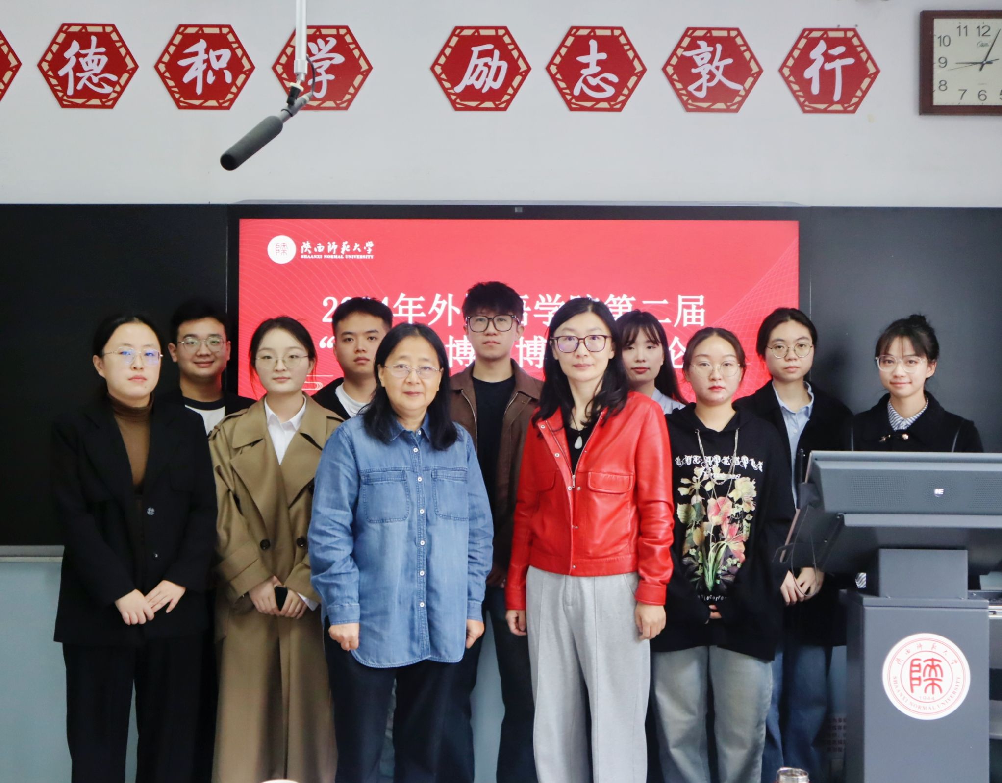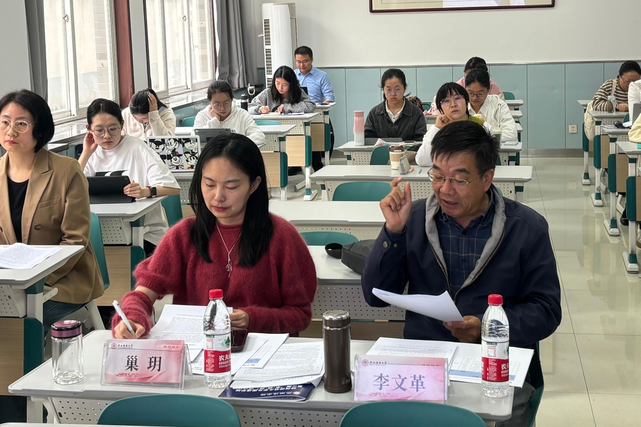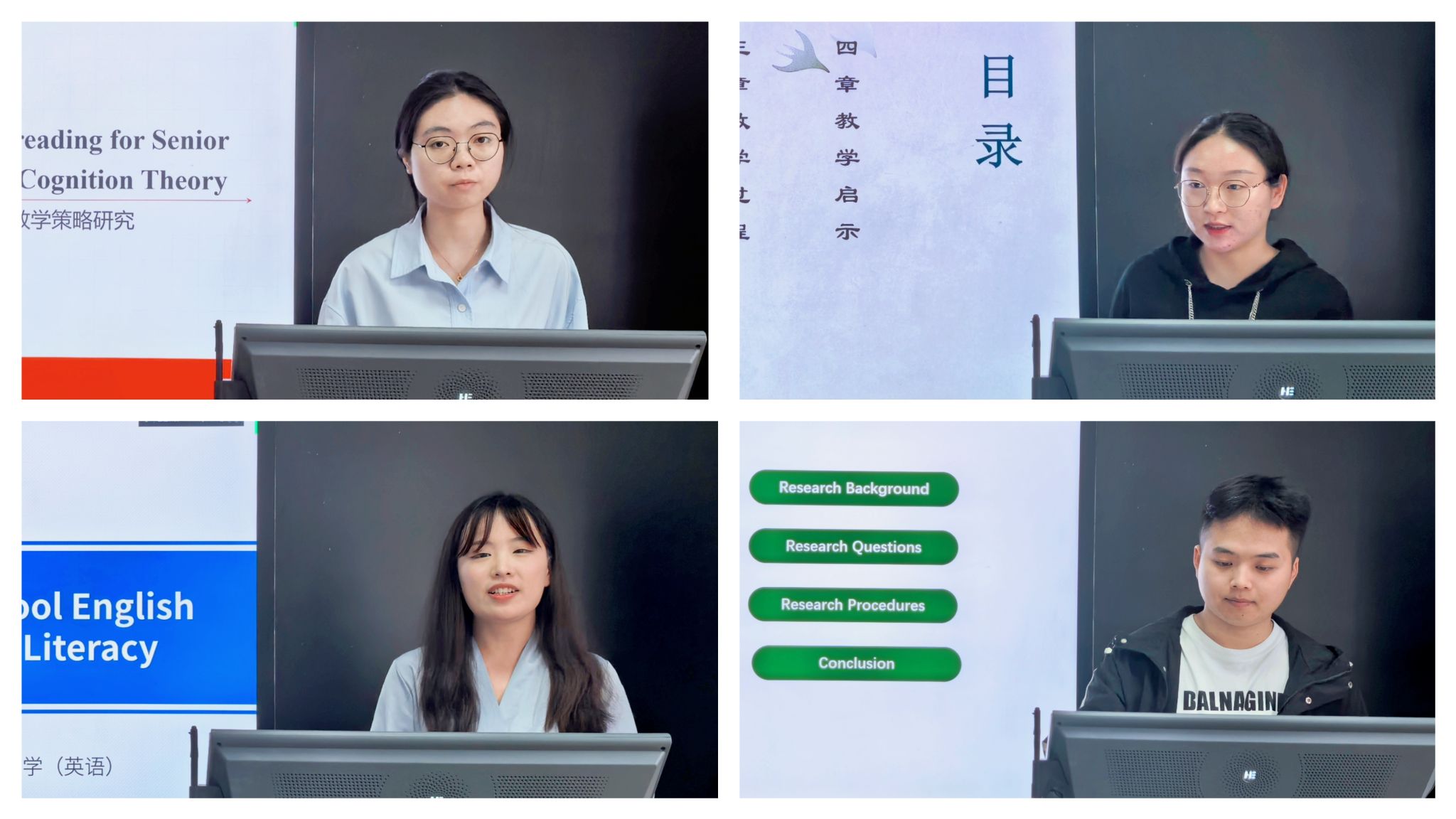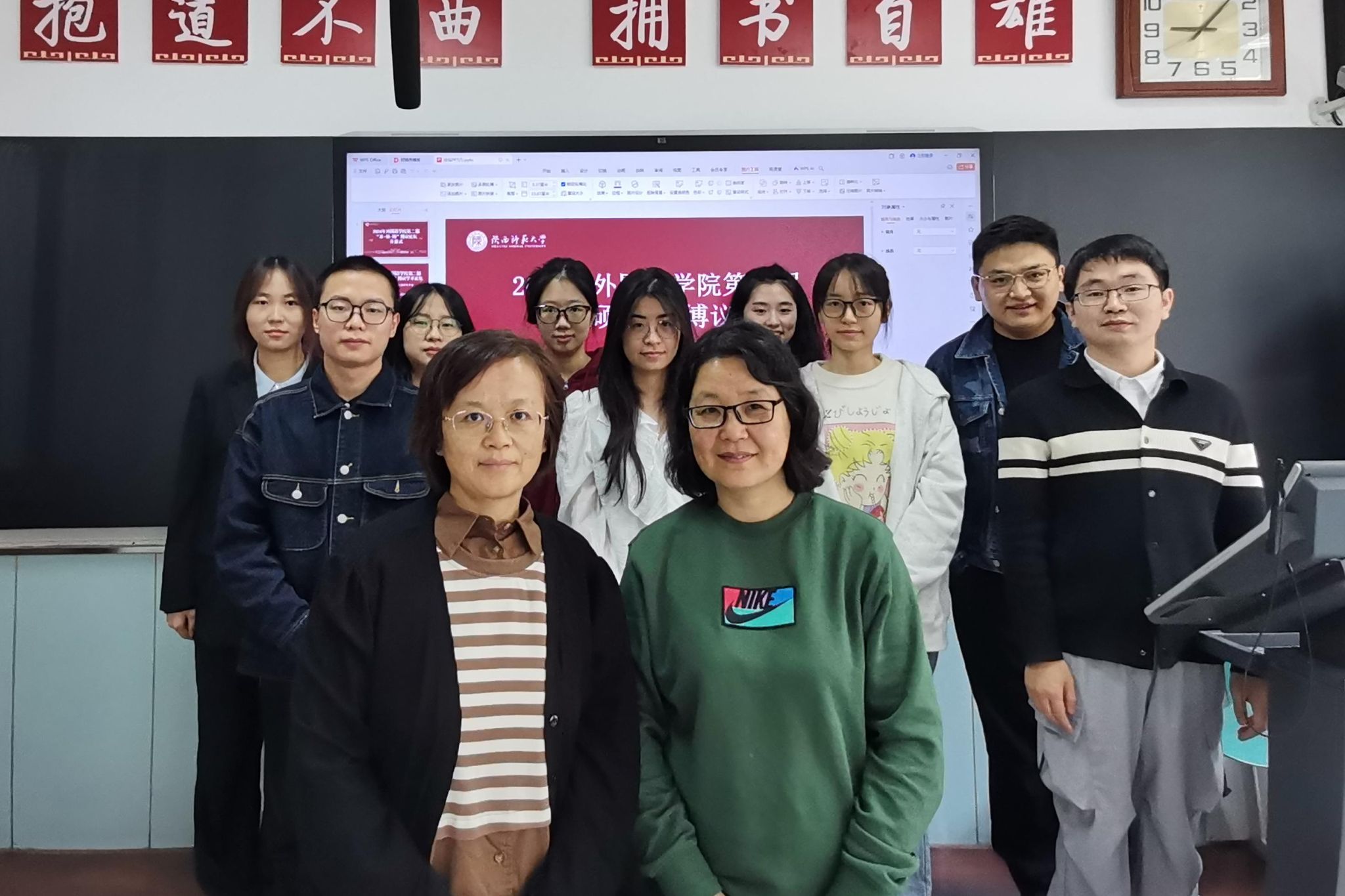 硕士生王艺超、程睿淇、张雨、周鹏羽、庞帅及韦誉君、李静萱、蔡雨暄、郭欣、郭雯雯、谢俊杰分别以“基于‘教一学一评’一体化的高中英语课堂教学评价量表中的问题与改进策略”“双减政策背景下初中英语作业设计研究”“内容依托式教学法对高中生批判性思维倾向的影响研究”“字幕类型对高中生附带词汇习得的影响研究”“职前英语教师反思能力发展研究”“实习期间职前英语教师身份认同变化的研究”“基于情境认知理论的高中英语深度阅读教学研究”“初中英语教师写作评价素养的个案研究”“PACE教学模式在初中英语语法教学中的应用研究”“全身反应法在小员工英语词汇教学中的应用研究”为题,围绕英语教学与评价、作业设计、教学法等多个方面,进行了深入的分享与交流。两位评委老师全程认真聆听、仔细记录,对每位同学的发言进行了细致的点评与指导。