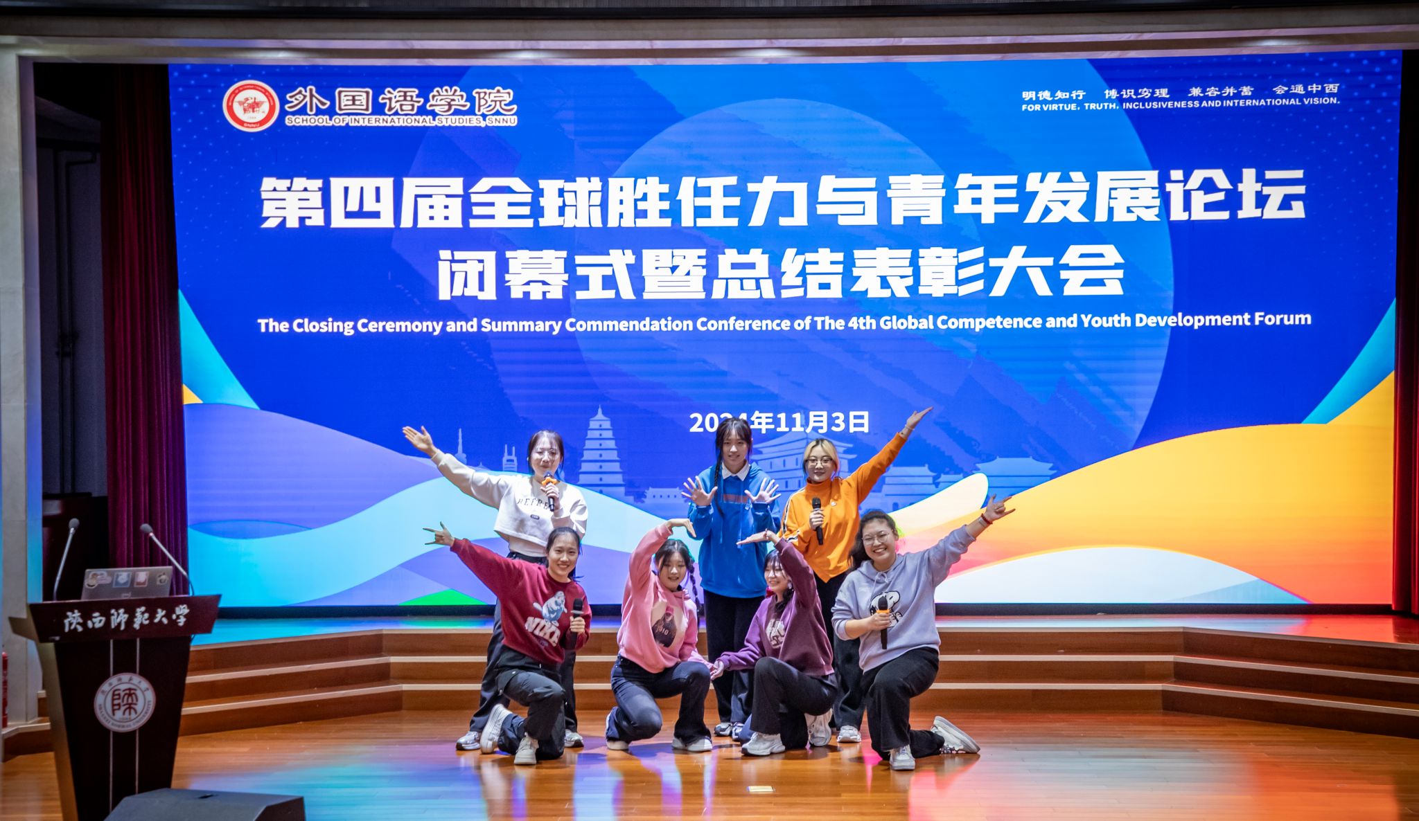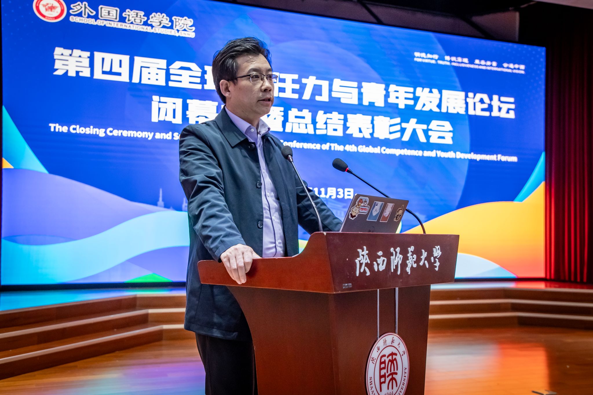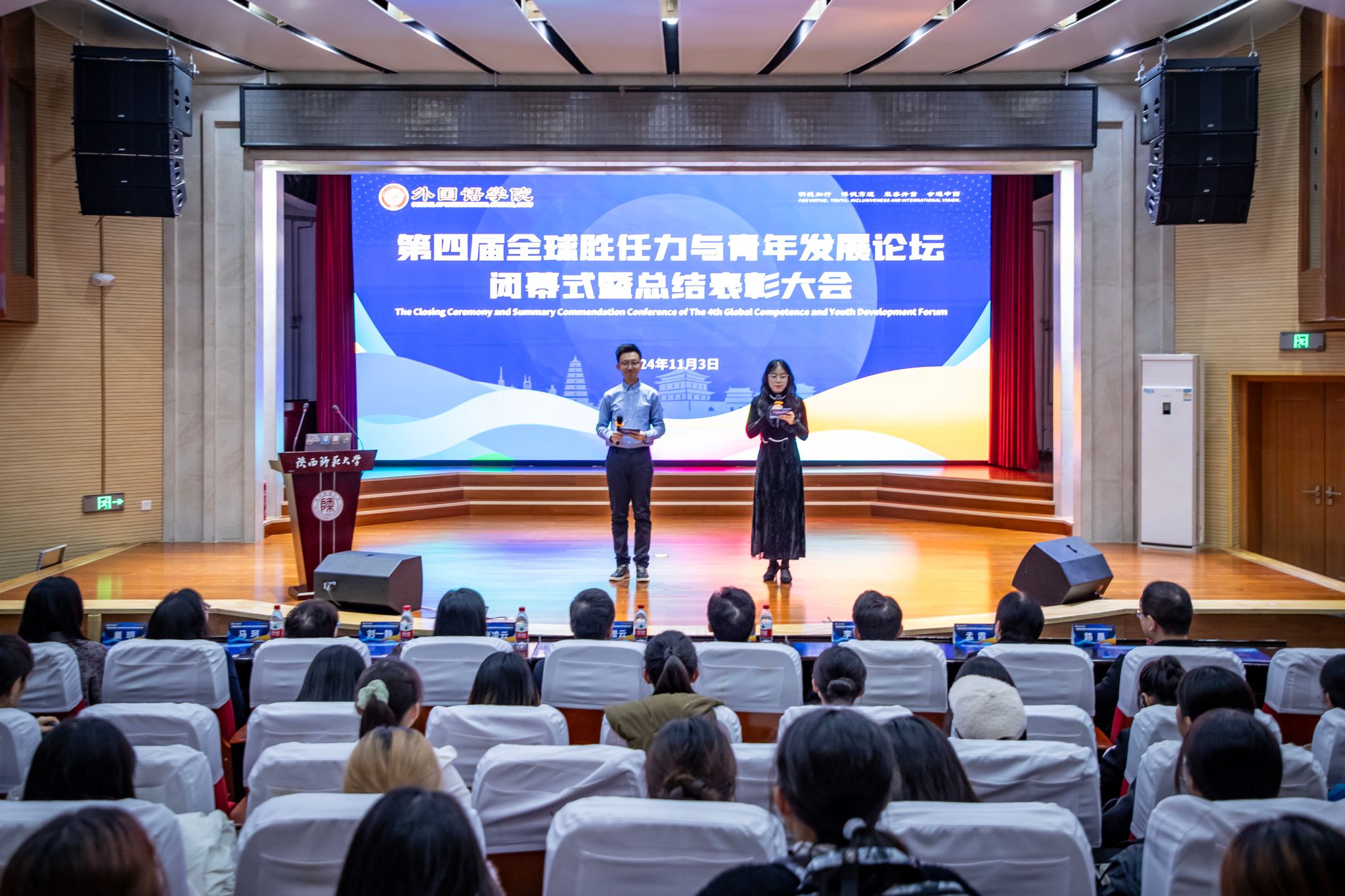2024年11月3日晚,太阳成集团tyc234cc第四届“全球胜任力与青年发展”论坛闭幕式暨总结表彰大会在太阳成集团tyc234cc雁塔校区逸夫楼二层报告厅举办。陕西秦创原国际路演中心总经理、太白智库副理事长李涛、西安外国语大学英文师范公司党委副书记刘一静、陕西网记者叶剑锋、太阳成集团tyc234cc国际交流与合作处处长张凌云、外国语学外国语学经理刘全国、外国语公司党委书记董增云、公司党委副书记鲁燕、俄语系主任孟霞、公共外语教学部主任马珂、翻译硕士专业负责人巢玥、法语系老师路晨、团委书记李丹、党委组织员董洁及全体辅导员老师出席本次论坛。论坛由太阳成集团tyc234cc辅导员高宇轩、2022级法语系员工李思颖主持。