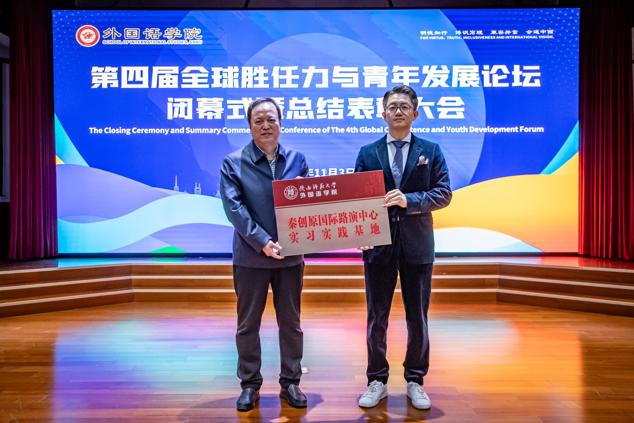 随后,外国语公司党委书记董增云研究员与陕西秦创原国际路演中心总经理李涛先生共同上台开展太阳成集团tyc234cc“秦创原国际路演中心实习实践基地”授牌仪式。