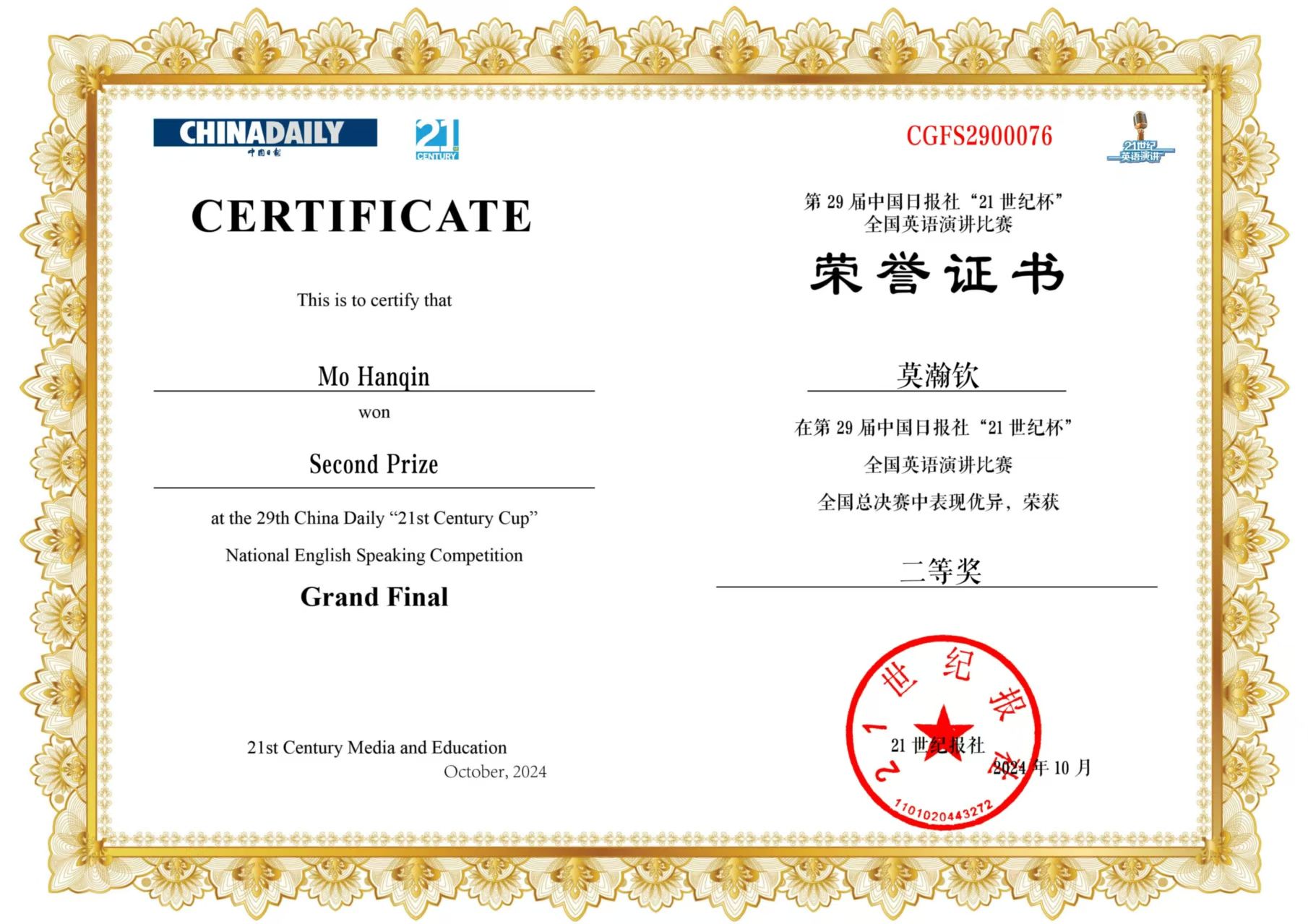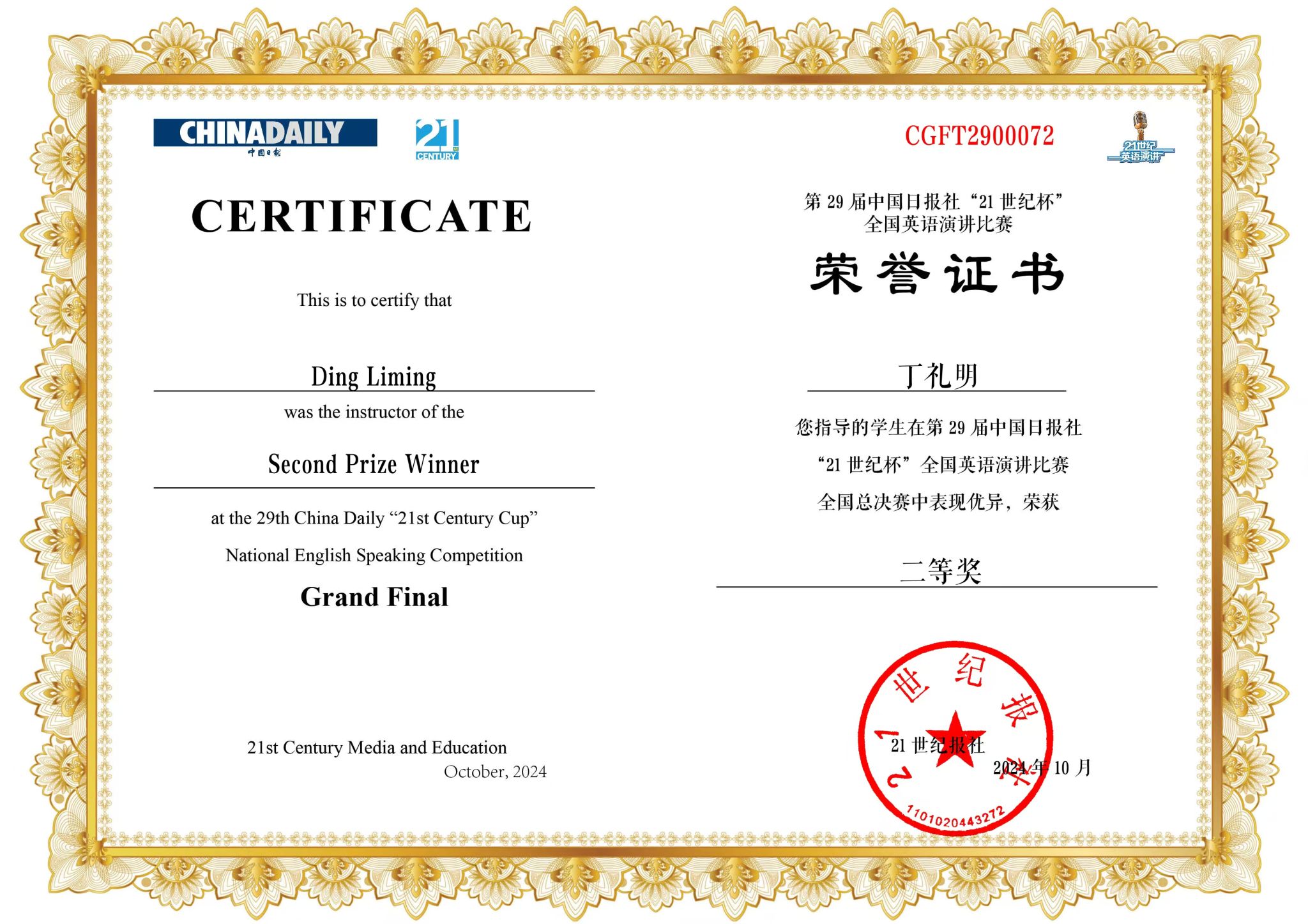 2024年10月17日至10月21日,由中国日报社、21世纪英语教育传媒承办的第29届中国日报社“21世纪杯”全国老员工英语演讲比赛全国赛在江苏无锡落下帷幕。全国总决赛共有来自各个省级赛区的246名选手。在经过5天、三轮的激烈比拼后,太阳成集团tyc234cc英语系2023级英语师范专业莫瀚钦同学获得全国二等奖,太阳成集团tyc234cc英语系丁礼明老师获得优秀指导教师奖。此次获奖也是老员工TOP外语成长训练营的阶段成果。