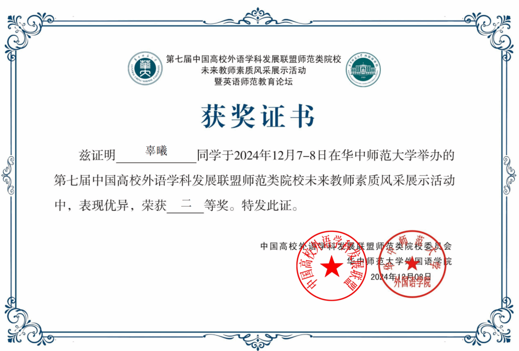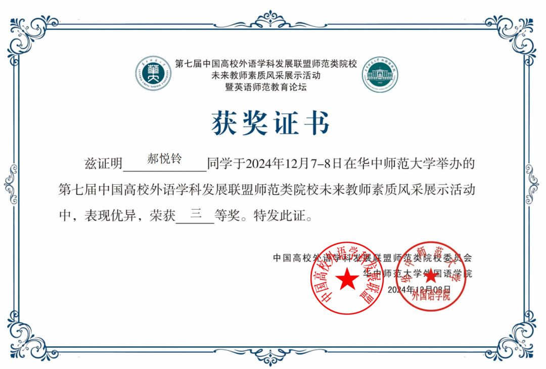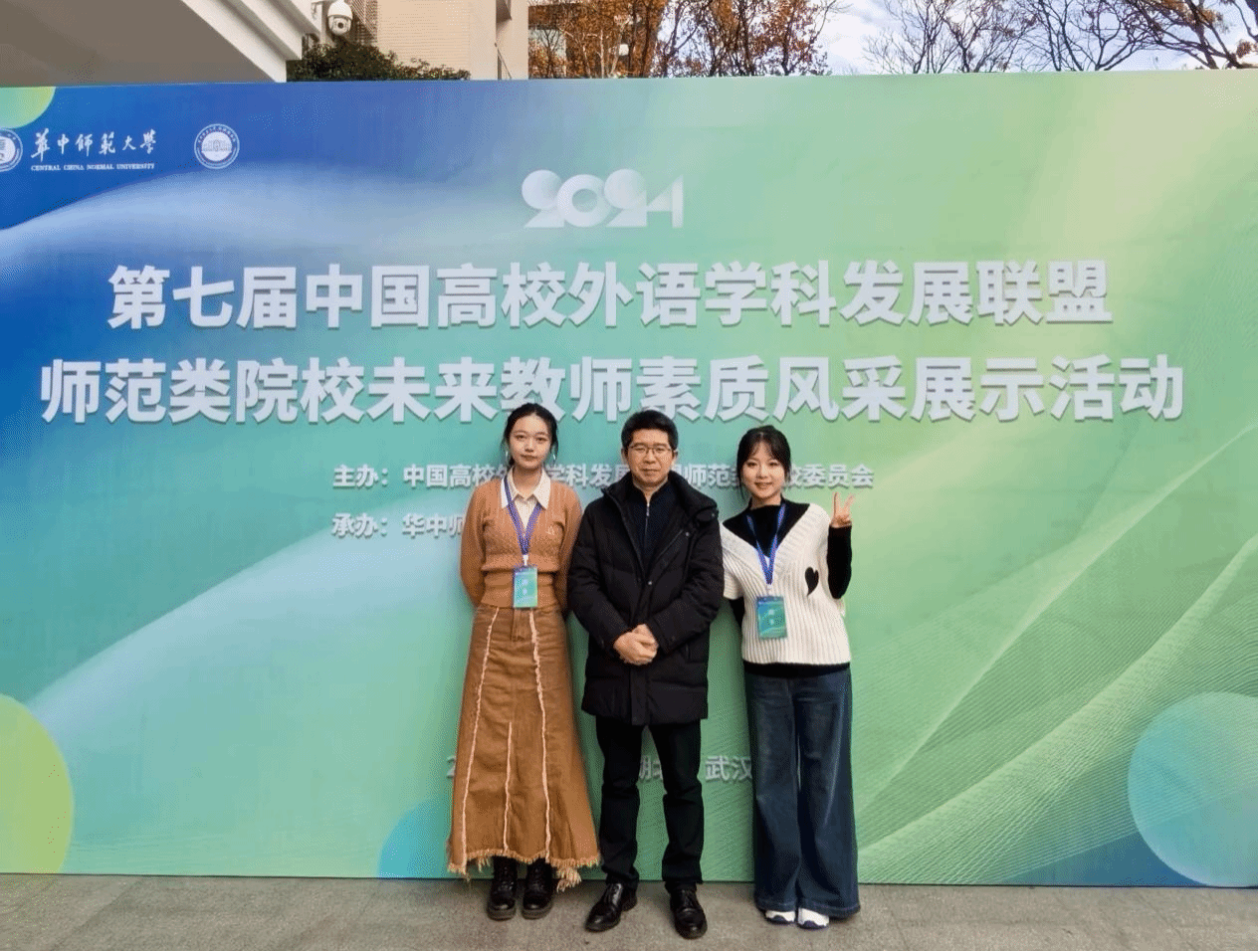 2024年12月7-8日,“第七届中国高校外语学科发展联盟师范类院校未来教师素质风采展示活动”在武汉举行。该活动由中国高校外语学科发展联盟师范类院校委员会主办、华中师范大学承办,来自全国41所院校的80名优秀师范生参加了此次活动。太阳成集团tyc234cc英语系2022级师范生辜曦、郝悦铃两位同学表现优异,分别获得二等奖和三等奖。指导老师杨冬敏、丁礼明荣获优秀指导教师称号。
