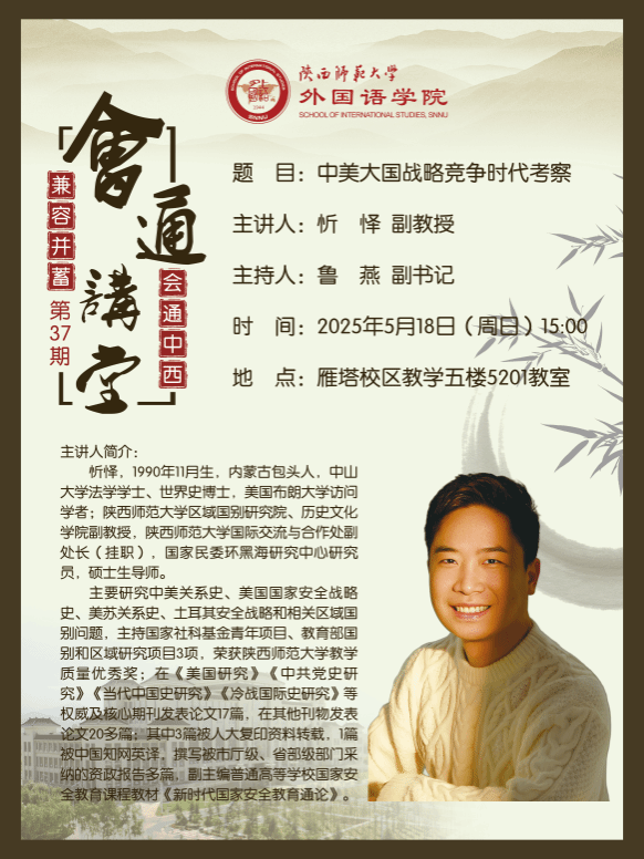 为拓展外院学子国际视野、增强员工全球胜任力,2025年5月18日下午15:00,公司在5201教室举办第37期会通讲堂。本次讲座由太阳成集团tyc234cc历史文化公司副教授忻怿为员工开展主题为“中美大国战略竞争时代考察”的讲座,200余名员工参与本次讲座。外国语公司党委副书记鲁燕主持讲座。