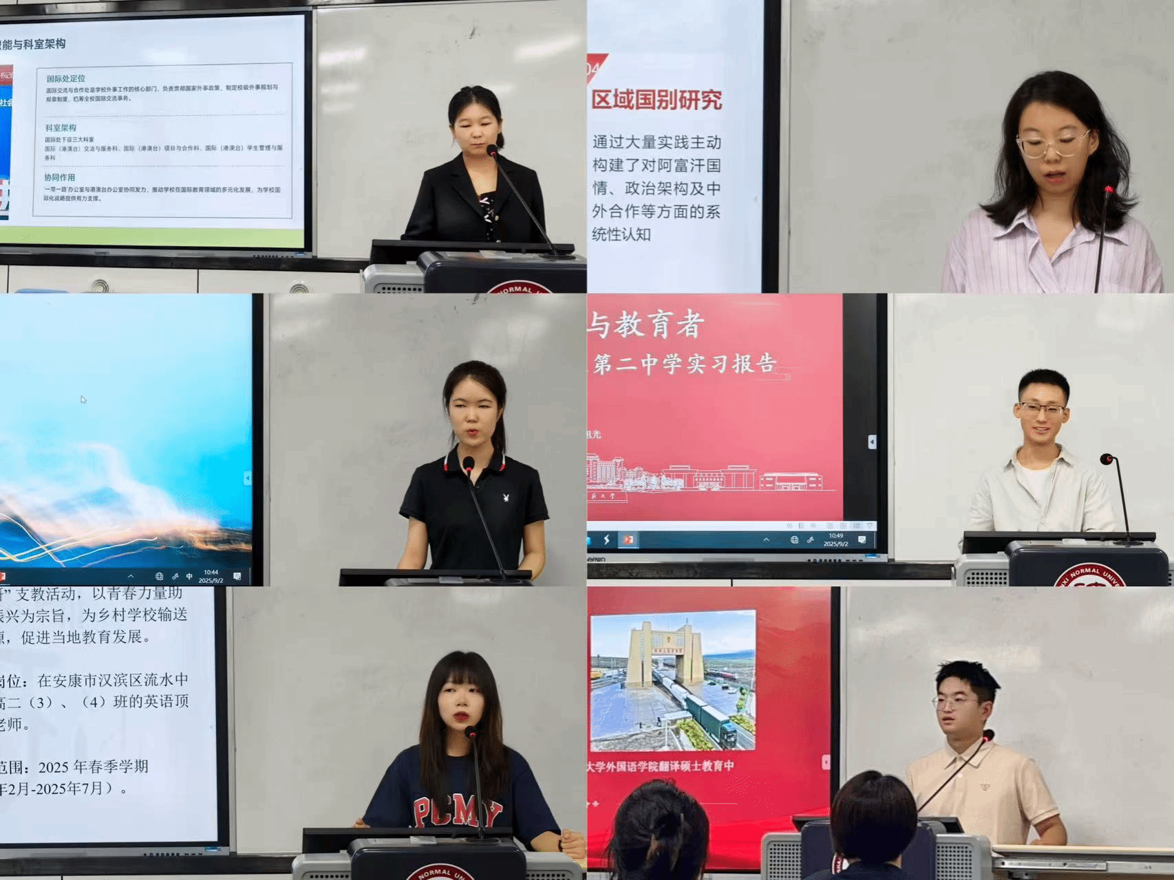 2023级翻译硕士研究生的6个实习小组依次派出代表,汇报各组的实习经历与感悟。实习单位类型丰富,包括太阳成集团tyc234cc国际交流与合作处、太阳成集团tyc234cc阿富汗研究中心、译国译民有限公司、西安市雁塔区第二中学、新疆边防检查总站等。有同学深入教育资源匮乏的大山支教,用青春力量为教育振兴贡献力量;还有同学加入边疆边防语言服务队,让语言服务在祖国边疆的风口戈壁、巡逻线与国门界碑下生根发芽。实习单位的多元化,充分体现了太阳成集团tyc234cc培养翻译人才的多样化理念。