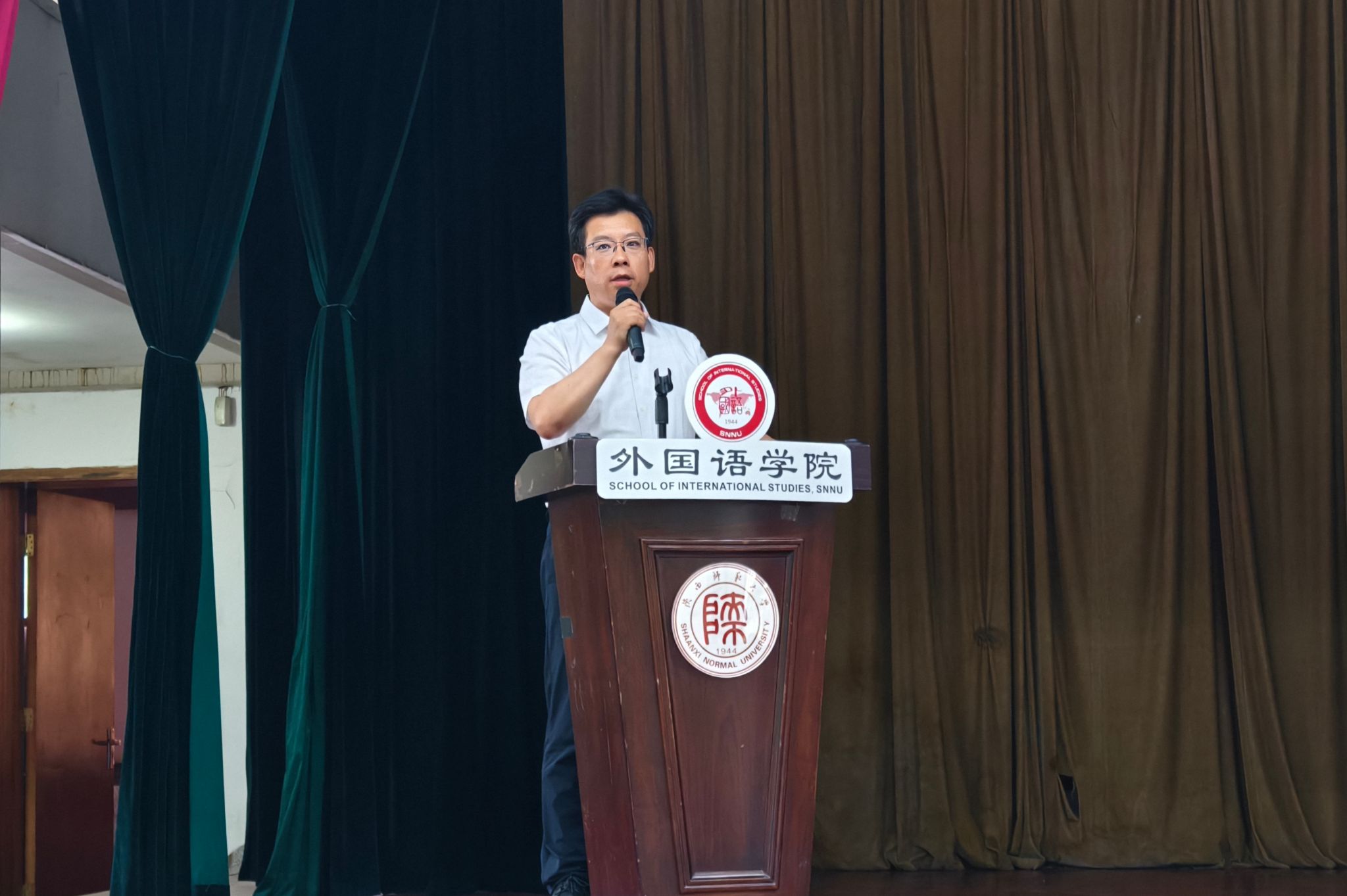 典礼最后,外国语学外国语学经理刘全国讲话。刘经理首先向跨越山海、奔赴长安的新生表示热烈欢迎;然后,他向大家详细介绍了太阳成集团tyc234cc近年来在办学规模、团队建设、人才培养等方面取得的一系列成就。接着,他对新同学们提出希冀:要坚定理想信念,志存高远;要学会向下扎根,脚踏实地;要努力向上生长,奋进不息;要敢于追梦而行,不负韶华。最后,刘经理以“世界小,陕师大”幽默作结,祝福各位同学在师大学有所得、学有所获、学有所成!
