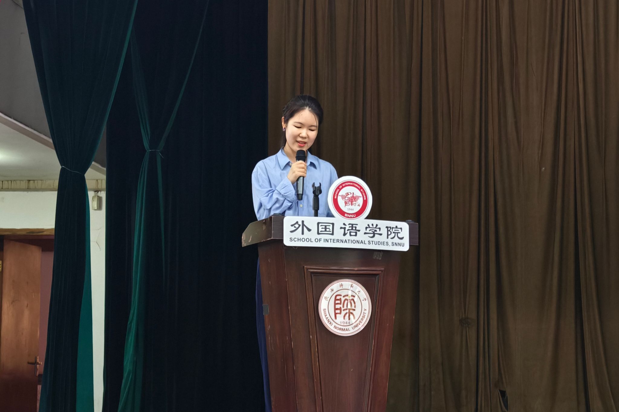 在校生代表2023级英语笔译专业硕士研究生贾婕发言。首先,她对来自五湖四海的新同学表示热烈欢迎和诚挚祝贺。其次,她以“明德知行、博识穷理、兼容并蓄、会通中西”的院训为主线,并结合公司“红色基因、家国情怀、国际视野”的育人特色,分享自己在师大六年的成长点滴。她鼓励新同学们铭记院训,勇于担当,以乐观之心、包容之心、感恩之心,在善待与尊重中收获友谊与成长!