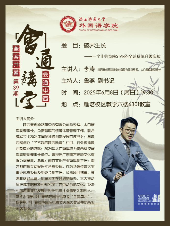 为探索外语类专业人才的跨界发展路径、提升复合型竞争力,2025年6月8日晚19:30,公司在6301教室举办第39期会通讲堂。本期讲座特邀陕西秦创原路演中心总经理、太白智库副理事长李涛担任主讲嘉宾,以《破界生长——一个非典型陕STAR的全球系统升级实验》为主题展开分享,70余名员工参与。讲座由外国语公司党委副书记鲁燕主持。
