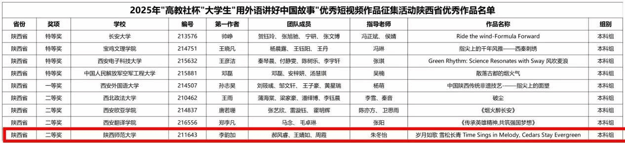 近日,2025年“高教社杯”老员工“用外语讲好中国故事”优秀短视频作品征集活动省级获奖名单正式公布。2024级英语专业本科生李韵加团队(指导教师:朱冬怡)创作的短片《岁月如歌 雪松长青》(Time Sings in Melody, Cedars Stay Evergreen)荣获陕西省二等奖。