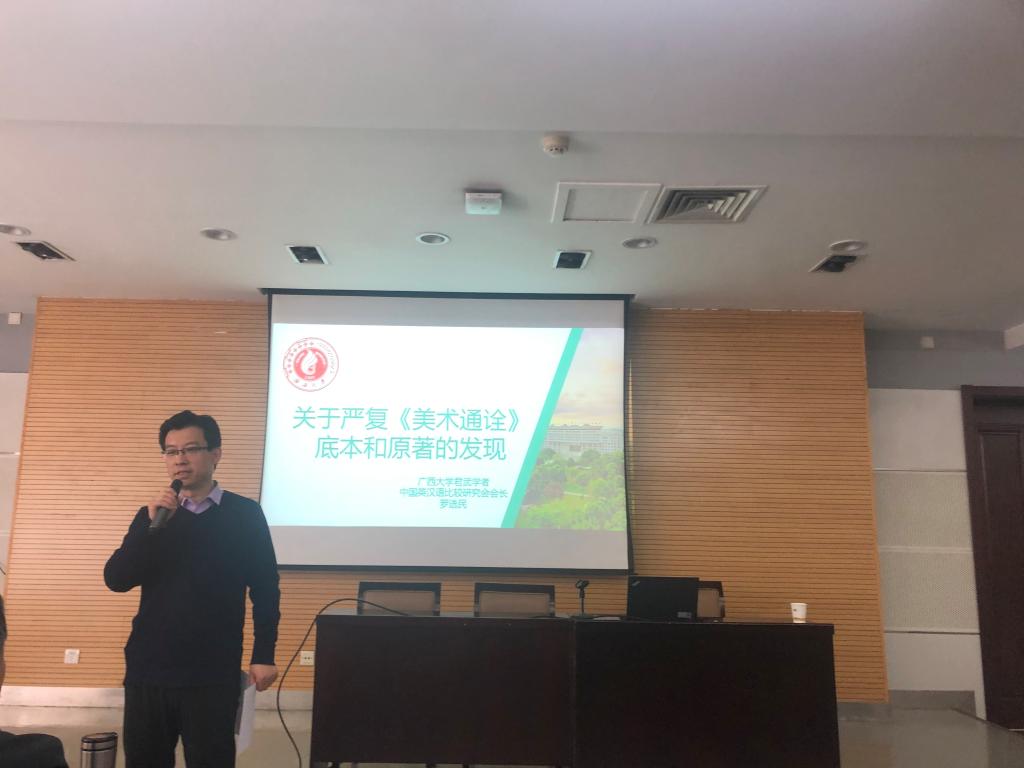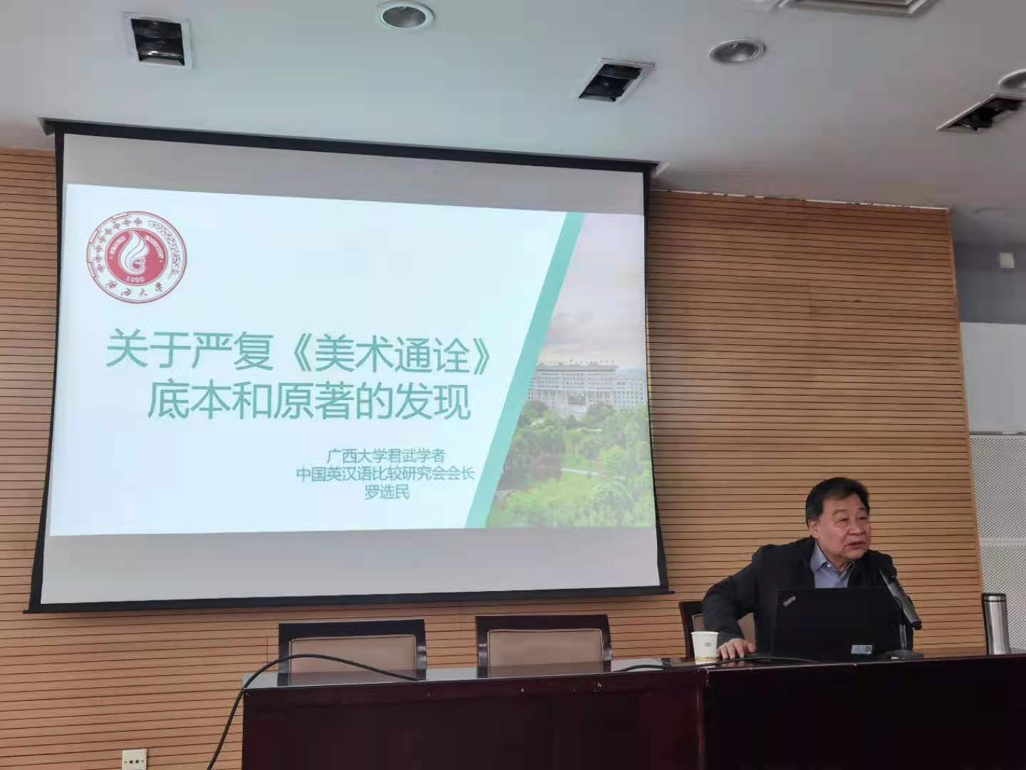 随后,罗教授介绍了关于严复《美术通诠》底本的相关研究及其原著的发现历程。他主要从以下四个方面展开细致的解读:严复的翻译历程、复旦学报文章事件、《美术通诠》底本和原著的发现以及发现的意义与启示。在第一部分,罗教授为我们介绍了严复的翻译经历与成就,其中最广为人知的便是严复提出了“信、达、雅”这一翻译原则与标准。对此,罗教授表示,严复的“信、达、雅”虽是因翻译社会科学著作而生,但它对文学翻译思想发展的指导意义不言而喻,它几乎可以说是19世纪末以来我国译论体系的唯一标志。在第二部分,罗教授提到了今年在《复旦学报(社会科学版)》上发表的《严复与中国文学观念的现代转型——以新见〈美术通诠〉底本为中心》一文。罗教授首先肯定了此文的学术价值,但接着又对其两位作者关于“底本的发现”的论述提出了原则性的纠正。罗教授讲到,早在2009年,他的员工于蕾就已经寻迹到了《美术通诠》的英文底本并撰写了相关论文,其具体的相关研究可见《译者可见性—严复〈美术通诠〉的个案研究》一文。罗选民教授还讲述了于蕾的论文写作历程,并阐述了严复《美术通诠》原著底本发现的重要意义。这一发现颠覆了人们以往普遍认为严复只关注政治、经济、法学、社会学等而忽略了文学和美学的错误观念。这不仅仅对严复研究具有重要的意义,而且对中国近代文学史乃至中国近代思想史都具有十分重大的意义。最后,针对老师们和同学们的现场提问,罗教授进行了详尽的解答。他鼓励在座的同学们要有突破学科界限的意识,无论走进哪一个领域,都应培养良好的外语学科气质。