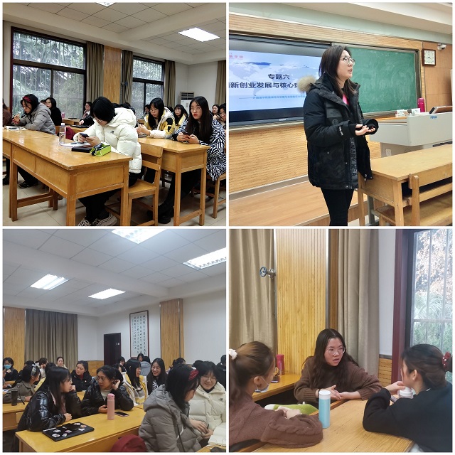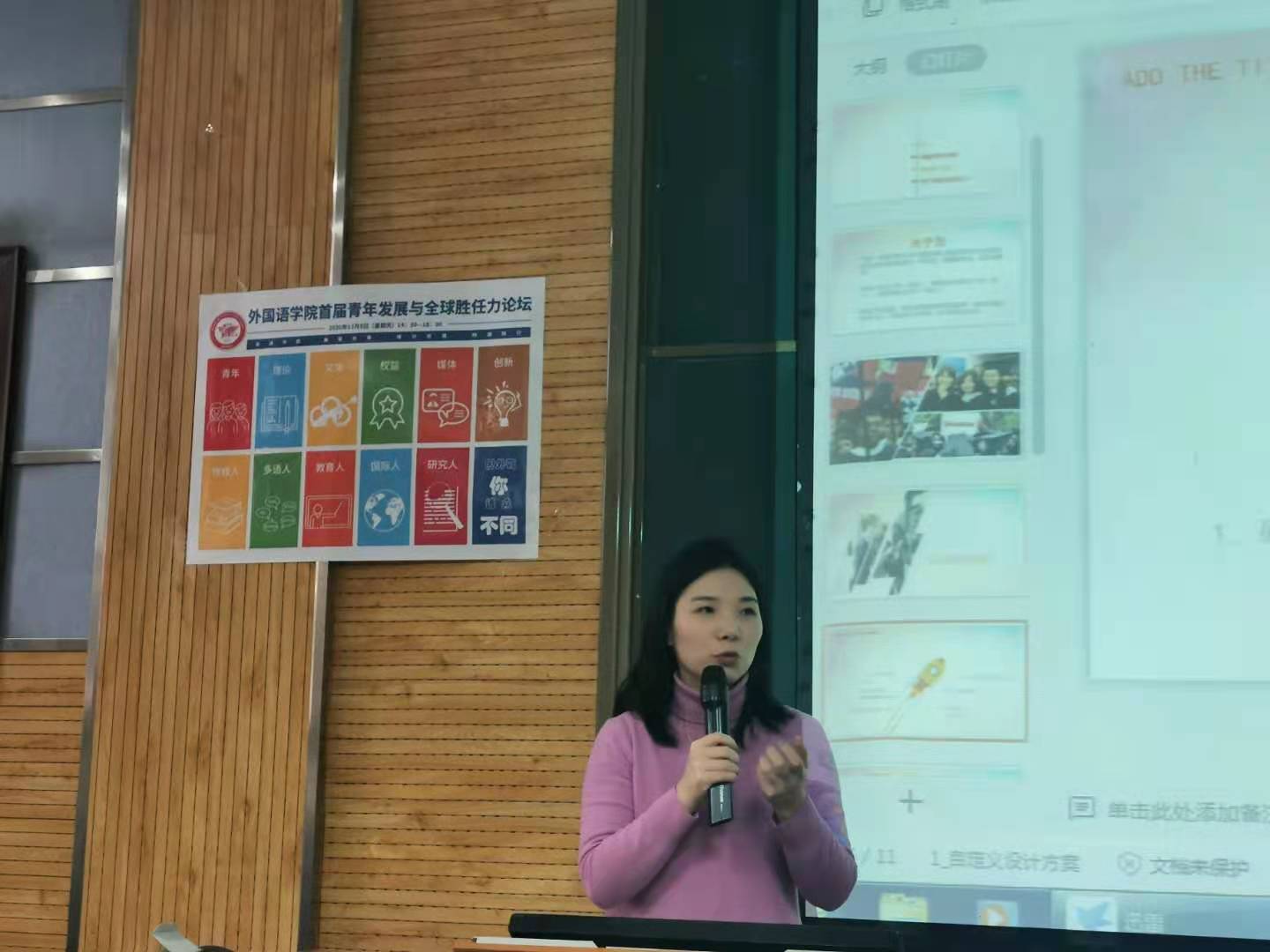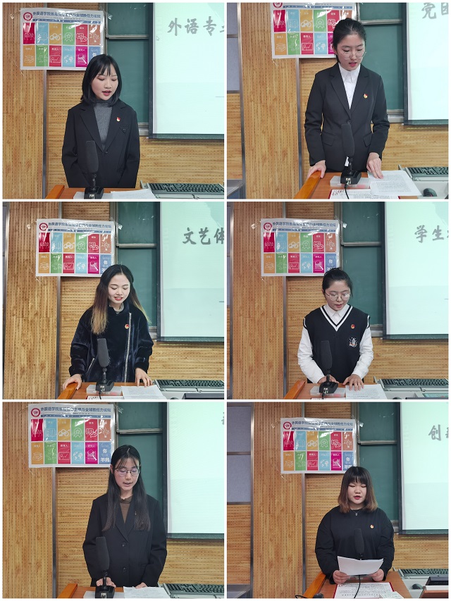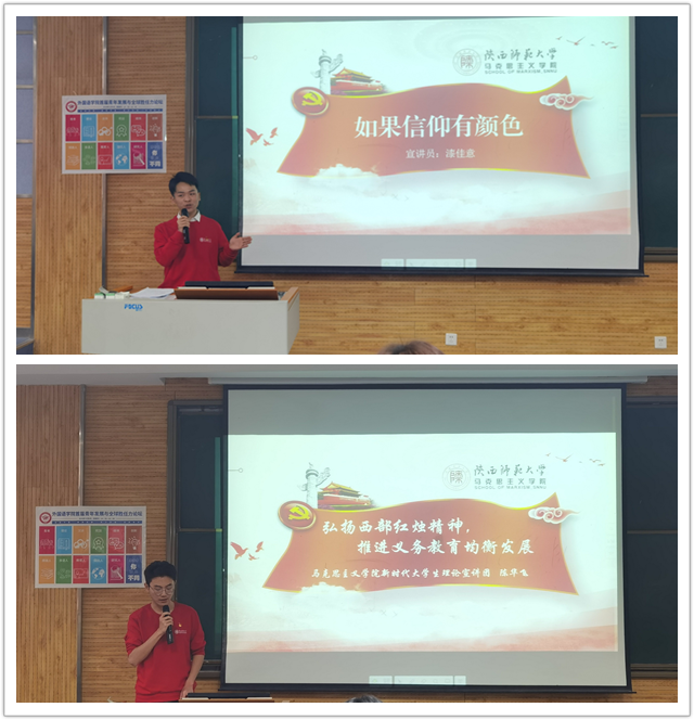 首先,由英语系陈蕾老师做主题报告“我的求学之路”。陈蕾老师分享了自身的求学历程和留学经历,鼓励外语员工开拓视野、不负韶华、勇敢逐梦。接着,马克思主义公司十九届五中全会宣讲团成员漆佳意、陈华飞两位同学分别从“如果信仰有颜色”“弘扬西部红烛精神,推进义务教育均衡发展”进行主题宣讲。