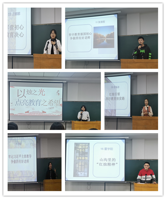 本次演讲比赛以“坚守教育报国初心,争做四有好老师”为主题,旨在贯彻落实习近平总书记关于教育的重要论述,传承弘扬“西部红烛精神”,提升师范生语言表达能力。经前期2019级师范生的全员参与,班级选拔推荐,最终共有19名选手参与本次比赛。霍宇阳同学以“山沟里的红烛精神”为题,通过分享其母亲在大学毕业后前往南泥湾的支教经历,深情阐释红烛精神的内涵,无不令现场评委和观众为之动容;徐开琳同学来自云南的山区,通过讲述高中母校的老师为教育事业无私奉献,对员工们温情关怀的故事,表达自己也要立志将“西部红烛”精神传承和弘扬的决心。