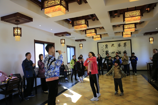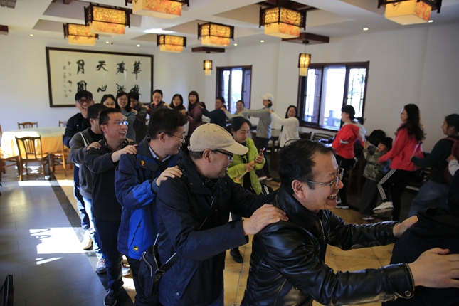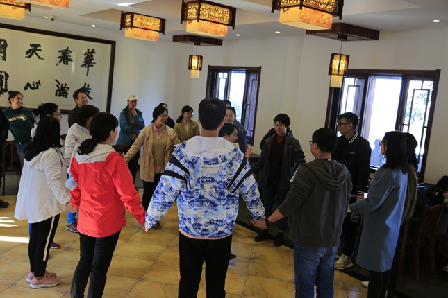 下山后,鲁燕主持组织心理游戏活动,大家兴致勃勃,全身心投入到了团结协作、接龙比赛、兔子舞等游戏中去,既放松了身体又愉悦了心情,在欢笑声中结束了本次行程。