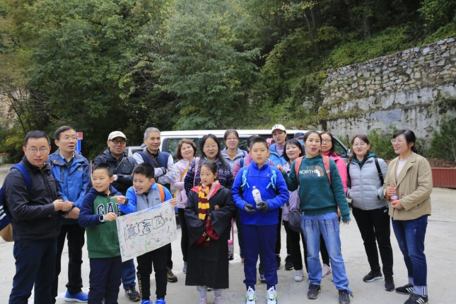 老师们组成三个登山小队,大家分别创建自己的队名、队歌和口号,一路互相帮助,欢歌笑语,用一首首正能量的歌曲自我激励,山路虽然陡峭,但大家基本都登到了山顶。在山顶欣赏秋日美景,老师们一同唱起《我和我的祖国》,引起了众多游客的共鸣,大家高声歌唱,歌声在幽幽山谷飘荡。