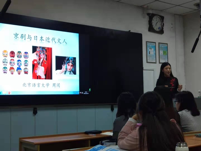 周阅教授首先从日本近代作家芥川龙之介的访中游记为开篇,以京剧这一传统中国艺术美为着眼点,展开了京剧与日本近代文人的探讨。随后又以辻听花等日本京剧爱好者对京剧的评价,以及谷琦润一郎等日本文学家的作品中出现的京剧元素展开,向大家介绍了比较文学中周教授所发现的新角度。周阅教授治学风格严谨,老师同学们进行了积极的互动交流。在提问环节中,英语系和文公司的老师以及日语系的几位同学与周教授展开了热烈的讨论。周阅教授最后强调,做学术因注重融会贯通,所在一字谓之博。