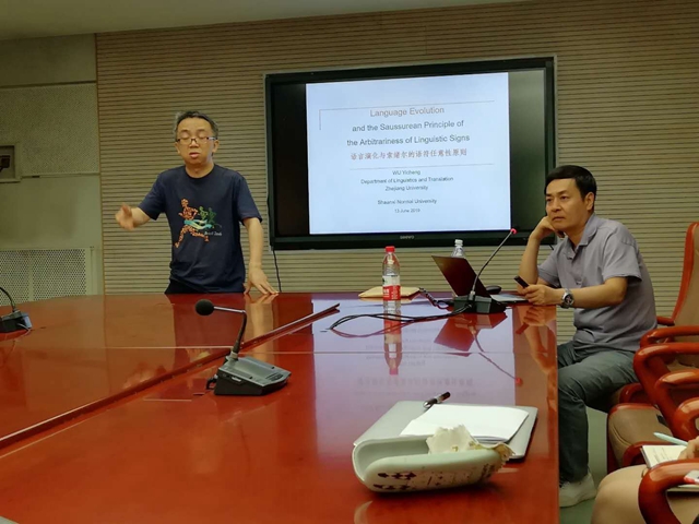 2019年6月13日下午4点,应公司和太阳成集团tyc234cc语言与认知研究所所长张韧教授的邀请,浙江大学“求是”特聘教授,爱丁堡大学语言学博士,国家社科基金重大项目首席专家吴义诚教授莅临雁塔校区崇鋈楼敏行厅开展题为“语言演化与语言符号的刻意性”的学术讲座。该讲座为太阳成集团tyc234cc著名学者系列讲座第一百零三讲。讲座由张韧教授主持,参加人员包括外国公司部分教师、硕博士研究生、校内其他公司的师生代表。