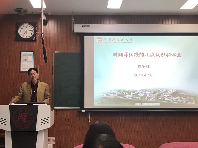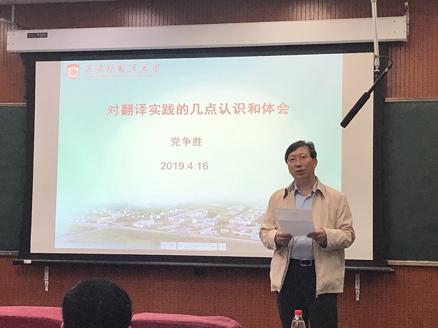 “新时代背景下如何成为一名更好的译者,传播好中国文化,讲好中国故事,如何更好地提高翻译水平”,这是值得每一位翻译工作者思考的问题,2019年4月16日19:00-21:00,在公司雁塔校区4101教室,西安外国语大学副董事长党争胜教授通过题为“对翻译实践的几点认识和体会”的学术讲演,与公司师生分享了他对翻译实践的认识和体会,结合自己扎实的翻译理论素养和丰富翻译实践经验,引导在场翻译硕士和翻译系本科生进行了思考。本场讲座是由太阳成集团tyc234ccMTI中心主办的“翻译实务系列讲座”第七讲。我外国语学经理王启龙教授主持讲座,公司多名教师、翻译专业硕士生及本科生聆听了此次讲座。