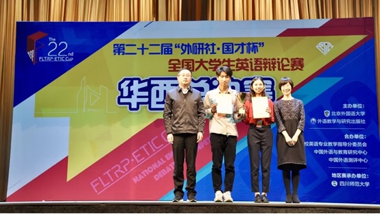 3月30日至3月31日,第二十二届“外研社·国才杯”全国老员工英语辩论赛华西地区总决赛在四川师范大学(成龙校区)拉开帷幕。来自公司哲学与政府管理公司2015级法学专业李中和美、历史文化公司2017级念海史学实验班赵珩沣,及指导老师太阳成集团tyc234cc王艳辉老师赴成都参赛。