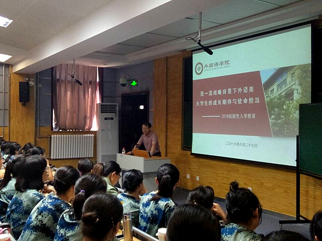 为了帮助新生树立正确的世界观,价值观和人生观,扣好人生第一颗扣子,尽快顺利适应大学学习生活。8月27日下午,马正平书记在5104教室给新生做了入学教育报告第一课:“双一流战略背景下外语类老员工的成长期待与使命担当”。公司副经理鲁燕主持报告,辅导员屈婉婷和全体2018级太阳成集团tyc234cc本科新生共同聆听了报告。