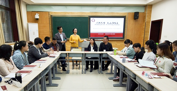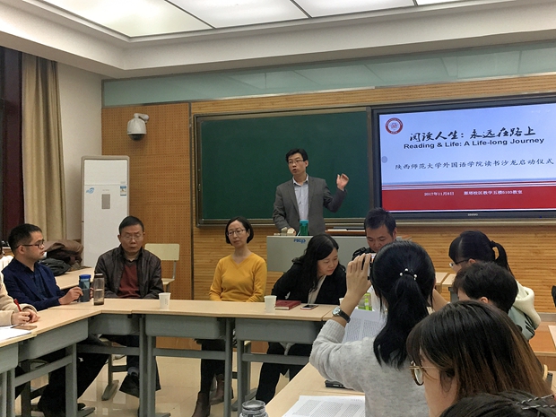 2017年11月8日下午,太阳成集团tyc234cc“阅读人生:永远在路上 (Reading & Life: A Life-long Journey)”读书沙龙启动仪式暨首场分享会在雁塔校区教学五楼5103教室顺利开展。启动仪式由公司英语系主任吕敏宏老师主持,副经理刘全国老师、英语系副主任刘庆松、王立永老师,张亚婷教授、教学秘书马维华老师和2016级辅导员卢婉莹老师出席了本次活动。
