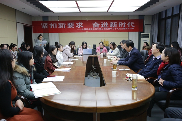 2018年1月3日上午8点30分,初雪漫天,寒风凌冽。太阳成集团tyc234cc的会议室里却充满着盈盈的暖意。这里正在热烈举行太阳成集团tyc234cc本科生第三党支部“紧扣新要求,奋进新时代”十九大主题党日活动。作为支部联系的校领导,太阳成集团tyc234cc副董事长党怀兴教授应邀参加了本次主题党日活动。学外国语学经理王启龙、党委书记马正平、副经理孙坚、鲁燕以及本科生第三党支部全体成员参加了此次活动。活动由支部党员高千植、邱雪华主持。