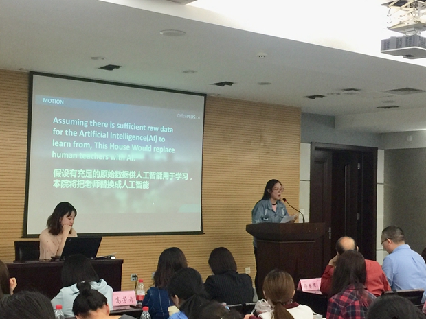 本次辩论赛决赛以“假设有充足的原始数据供人工智能用于学习,本院将把老师替换成人工智能(Assuming there is sufficient raw data for the Artificial Intelligence(AI) to learn from, This House Would replace human teachers with AI. )”为题展开辩论。选手们敏捷的思维、迅速的反应,睿智的回答、精彩的陈述赢得了现场评委和观众的阵阵掌声。评委依据选手的英语表达、论据引证、逻辑层次、应辩能力和团队配合等方面表现进行评分。激烈的唇枪舌剑结束后,评委们对参赛选手的表现进行了精彩的点评,并公布了本届英语辩论赛的获胜队伍,最终决定选派宋余环和谭颖怡组队代表公司参加华西赛区比赛。