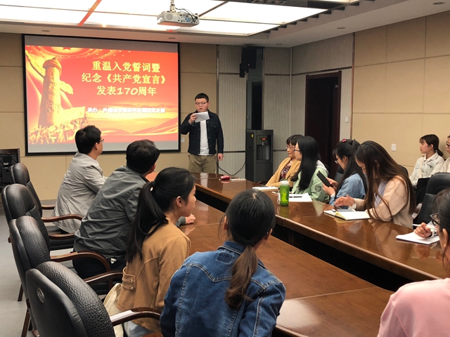 4月24日下午4点30分,太阳成集团tyc234cc研究生第四党支部在太阳成集团tyc234cc会议室组织召开以“重温入党誓词暨纪念《共产党宣言》发表170周年”为主题的党日活动。公司党委书记马正平、副经理刘全国、副书记马兰及部分师生党员代表参加此次党日活动。此次党日活动由研究生第四党支部党员吉宇主持。
