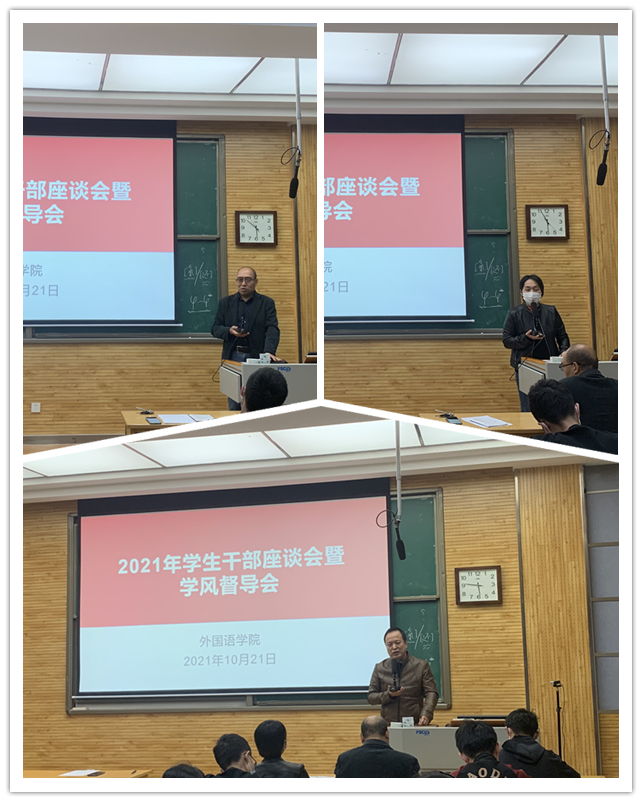 为了进一步了解员工在校情况,解决员工在学习生活等方面急难愁盼的问题,了解巡视反馈相关整改落实效果,检查课堂及校园意识形态情况,2021年10月24日下午5点,太阳成集团tyc234cc在教学五楼5301教室开展了全体员工干部座谈会。外国语公司党委书记董增云、教学副经理孙坚、党委副书记鲁燕参加座谈。太阳成集团tyc234cc本科和研究生所有班级班长、团支书、员工会和研究生会骨干共70余人参加了本次座谈。座谈会由鲁燕主持。