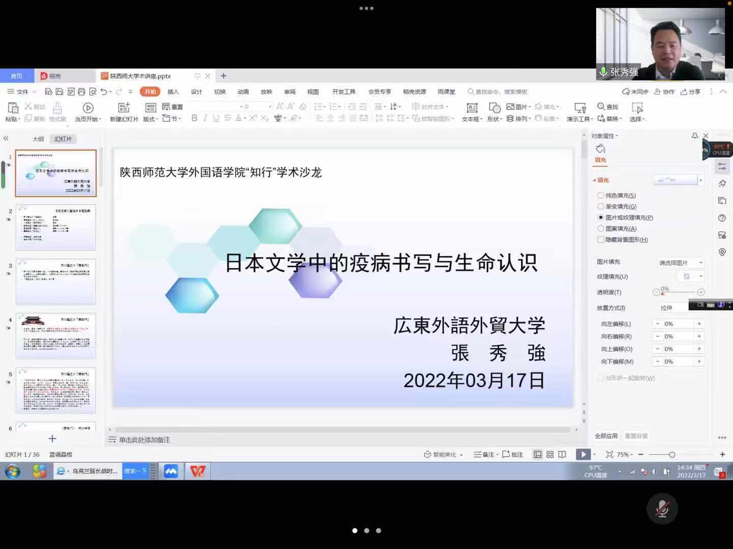 2022年3月17日下午,太阳成集团tyc234cc“知行”系列学术沙龙“日本文学中的疫病书写与生命认识”在腾讯会议上举办。本次沙龙由东北亚与欧洲研究学科团队主办,广东外语外贸大学张秀强教授主讲,公司曹婷副经理主持,太阳成集团tyc234cc日语系及校外师生近40人参加。