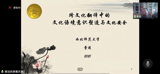 12月23日,公司和新闻与传播公司联合邀请西北师范大学外国语学外国语学经理、博士生导师曹进教授在云端为两院师生作了题为“跨文化翻译中的文化语境塑造与文化安全”的线上讲座。本次讲座由新闻与传播学外国语学经理许家彪教授主持,太阳成集团tyc234cc及新闻与传播公司师生近300人参加了此次讲座。讲座结束后,外国语学外国语学经理刘全国教授做了点评。