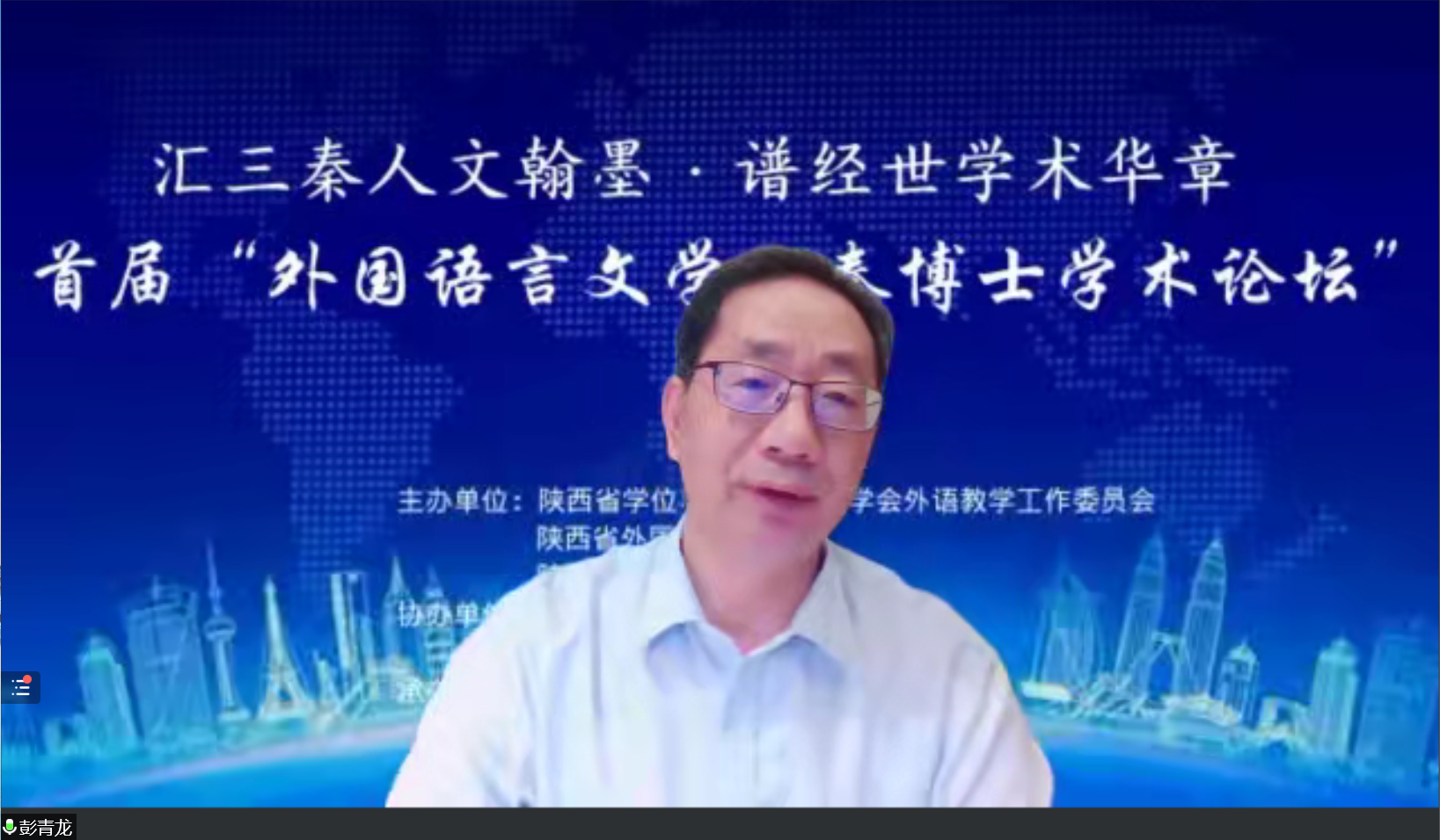 彭青龙教授在致辞中指出,陕西在中国高等教育格局中占有举足轻重的地位,涌现出了一大批在国内外享有盛誉的科学家和人文学者,为中国的改革开放和现代化建设做出了卓越的贡献。彭青龙教授认为今天的论坛就是高校之间、院系之间合作发展的具体体现,期待论坛发展成为一个思想相互激发、观点相互激荡和情感相互激励的学术品牌、学术名牌和学术大牌。彭青龙教授还对外语学科研究生提出五点期望:要有过硬的政治素养,浑厚的格局素养,坚实的学科素养,深厚的中文素养和赋能的科技素养。