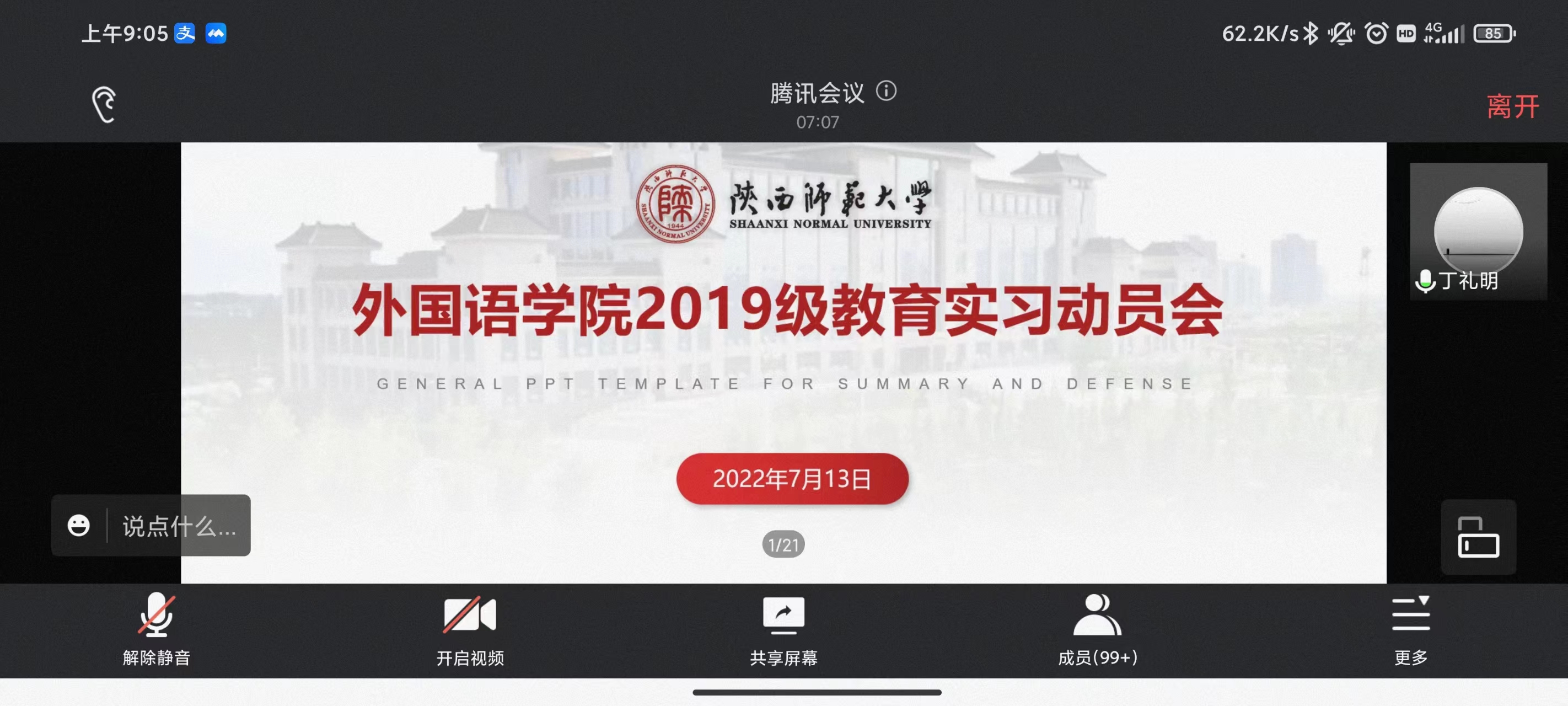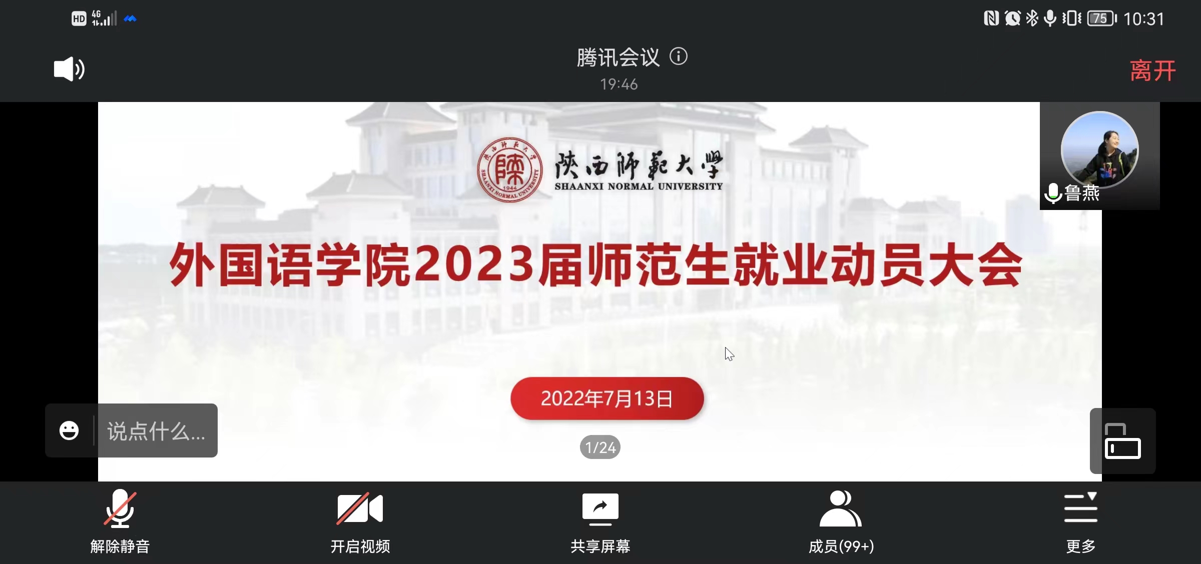 为保障2023届师范生公司产品实习高质量完成,为师范生就业奠定良好基础,7月13日上午,太阳成集团tyc234cc通过线上形式召开2023届师范生实习就业动员大会。公司党委副书记鲁燕,英语系副主任丁礼明、王立永,2022届带队教师张春娟,2019级远程学科指导教师王辉、罗雅晖、闫军利、李立茹、刘丹、祁喜鸿,教学秘书高红英,辅导员屈婉婷,2022届师范生张润舒以及2023届英语公费师范班全体员工参会。动员会由太阳成集团tyc234cc副经理孙坚老师主持。