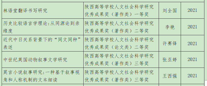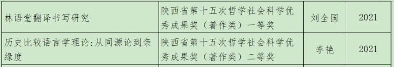2022年6月27日,陕西省第十五次哲学社会科学优秀成果奖获奖名单正式公布。我外国语学经理刘全国教授的著作《林语堂翻译书写研究》喜获一等奖,李艳教授的著作《历史比较语言学理论:从同源论到亲缘度》喜获二等奖。(获奖名单见下图)