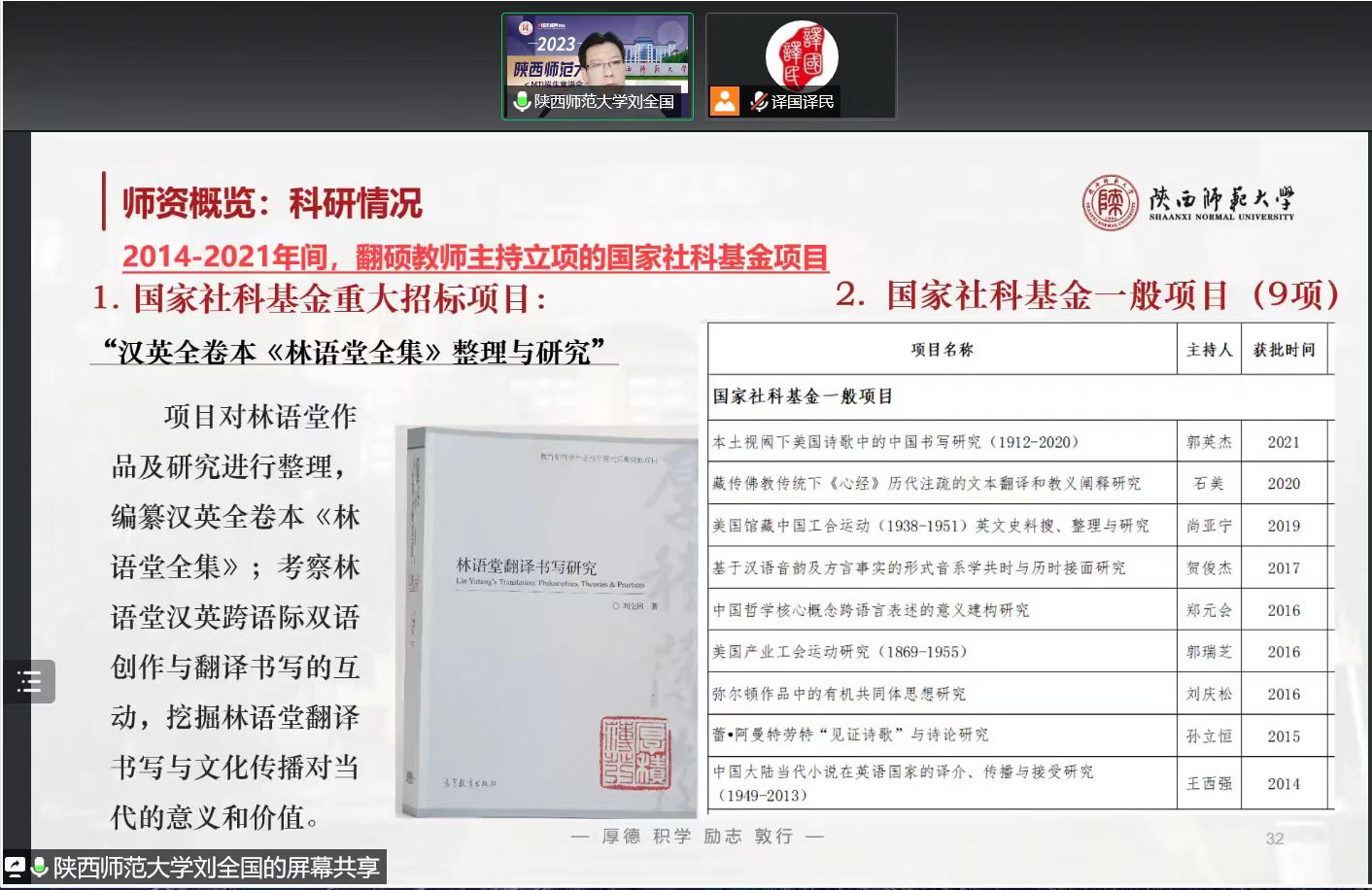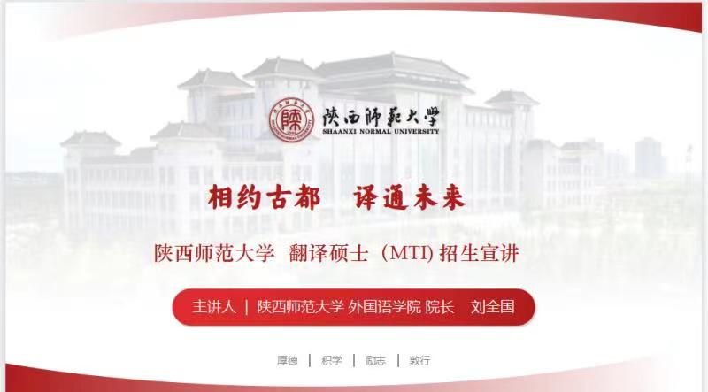 应“译国译民”教育平台邀请,我外国语学经理、MTI中心主任刘全国教授于2022年8月16日下午15:00做了题为“相约古都 译通未来”的MTI在线招生宣讲报告。全国多所院校在读本科生、多家翻译公司总经理和多所高校MTI负责人等200余人参加了宣讲会,并参与互动提问。