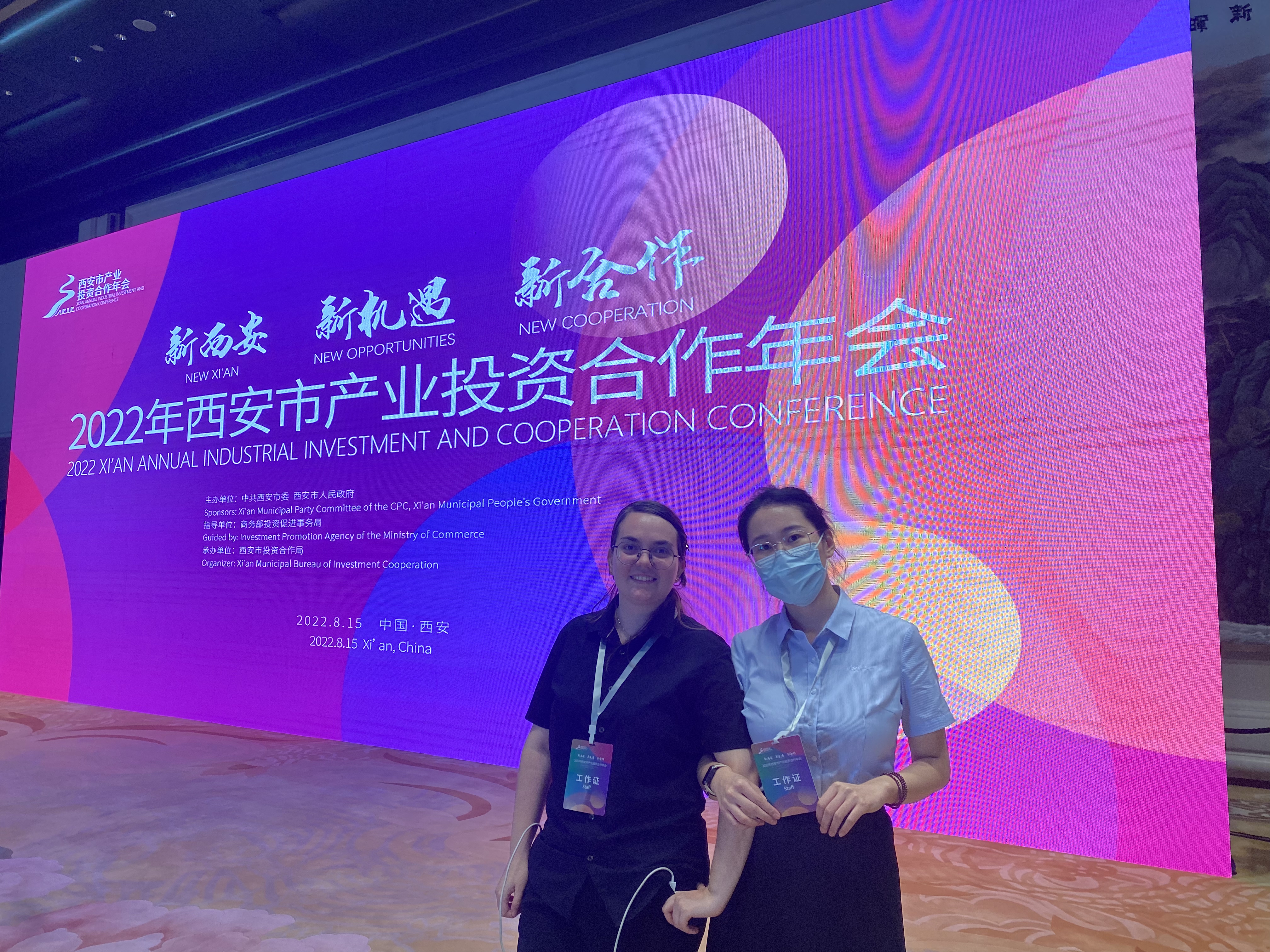 2022年8月15日,由中共西安市委、西安市人民政府主办的“西安市产业投资合作年会”召开,受公司MTI教育中心委派,公司2021级翻译硕士研究生张江薇、王一翔、列拉以西安市投资合作局实习生身份担任年会工作人员,负责会场布置、候场、转场等工作。