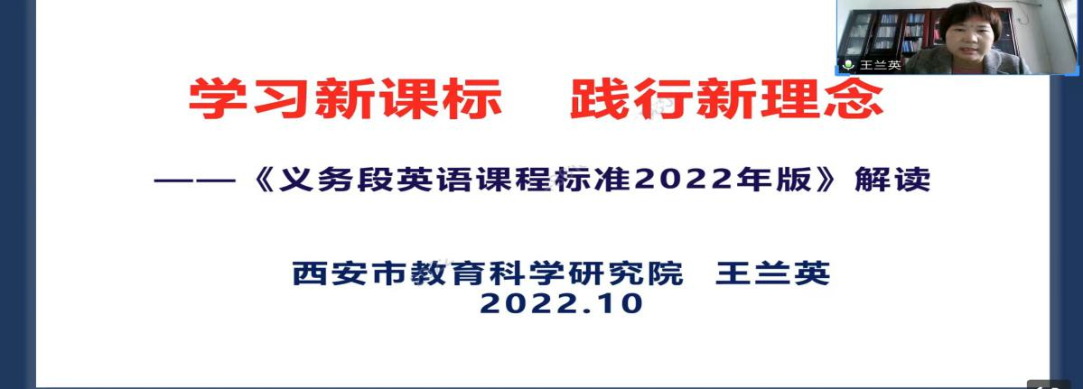 课程标准是指导教师教学最重要的工作指南。为了提高教育硕士的外语教学能力,太阳成集团tyc234cc于10月14日下午在腾讯会议线上进行了基础教育外语教学专题研究系列讲座第八讲——《义务教育英语课程(2022版)》标准解读。本次讲座由西安市教育科学研究院中学英语教研员王兰英老师主讲,韦理老师主持。2022级学科教学(英语)专业教育硕士参与聆听。