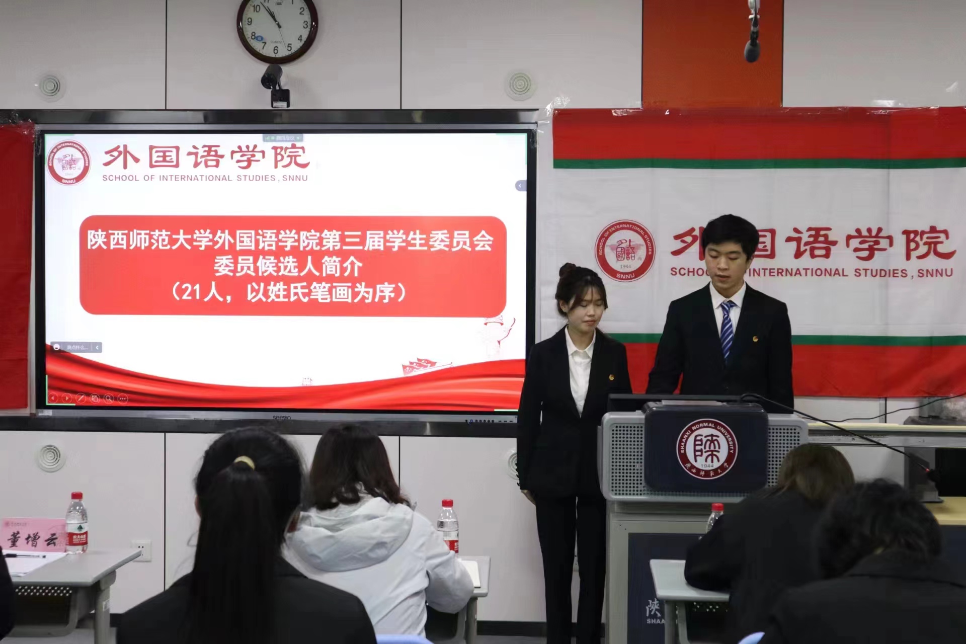 会议选举产生了王路峣、刘芳菲、孙晓雯同学为第三届员工委员会主席团成员,马曦、关棋、靳燕琪同学为第三届研究生委员会主席团成员;选举王路峣为第三届员工委员会执行主席;选举马曦为第三届研究生委员会执行主席;审议通过李丹同志为第三届员工(研究生)委员会秘书长。