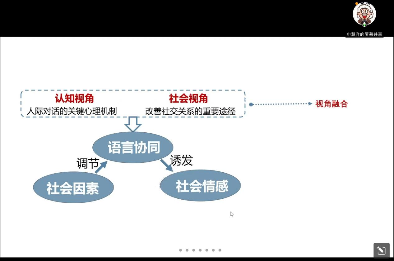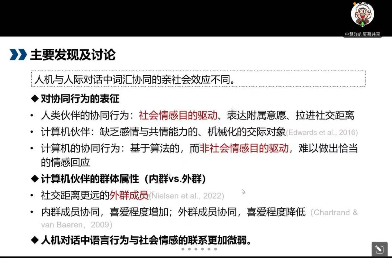 最后老师向大家展示了该研究的主要发现以及一些讨论。实验发现在语言层面上的协同能够激发亲社会情感,单个词汇的协同便足以激发人们的亲社会情感;其次,人机与人际对话中词汇协同的亲社会效应不同,主要表现在三个方面:对协同行为的表征、计算机伙伴的群体属性以及人机对话言语行为与社会情感的练习更加微弱。最后,老师对该研究的启示进行了总结概括并对同学们的提问进行了详细的解答。