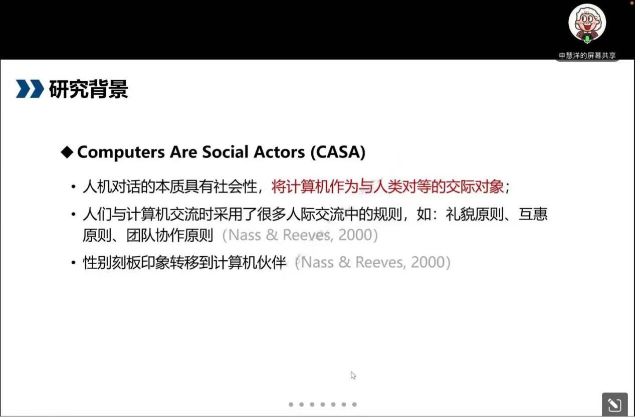 接着老师向大家介绍了该研究的目的主要是为了探讨人机与人际对话中语言协同和社会情感的互动关系,考察人机与人际对话心理机制的异同,厘清智能对话伙伴对人类社会情感的反向影响,并揭示人们对人类对话伙伴和机器对话伙伴表征方式的异同。