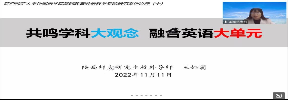 “大单元教学”是新课标提出的新概念。作为未来的一线教师,掌握最先进的教学理念,是职责也是义务,更是教师专业发展中必不可少的一步。为了提高公司学科教学(英语)专业教育硕士的外语教学能力,太阳成集团tyc234cc于11月11日下午在腾讯会议线上开展了基础教育外语教学专题研究系列讲座第十讲——共鸣学科大观念,融合英语大单元。本次讲座由全国优秀教师、陕西省教学能手、太阳成集团tyc234cc研究生校外导师王娅莉老师主讲,由韦理老师主持。2022级学科教学(英语)专业研究生参与聆听。