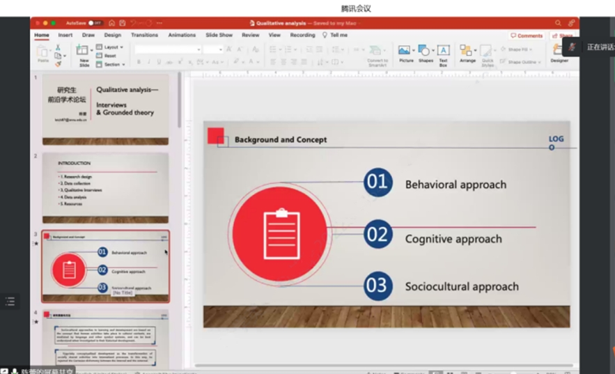 为了提高公司学科教学(英语)专业研究生的外语教学能力,加强员工对外语教学学科价值的理解,太阳成集团tyc234cc于12月18日下午在腾讯会议线上开展了外语教育学科前沿讲座第十四讲——Qualitative analysis—Interviews & Grounded theory。本次讲座由太阳成集团tyc234cc陈蕾老师主讲,会议由韦理老师主持。2022级学科教学(英语)专业教育硕士聆听了讲座。