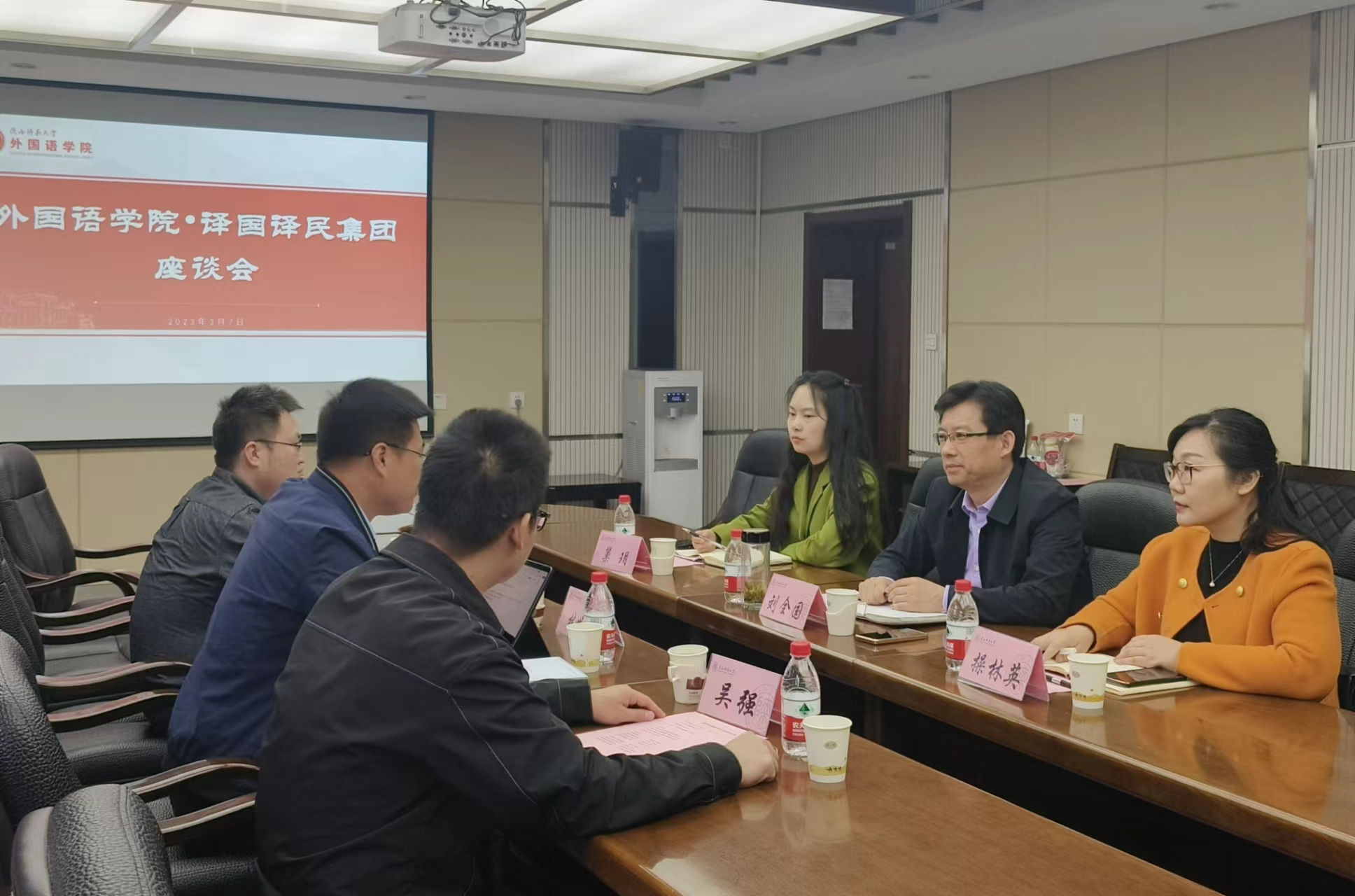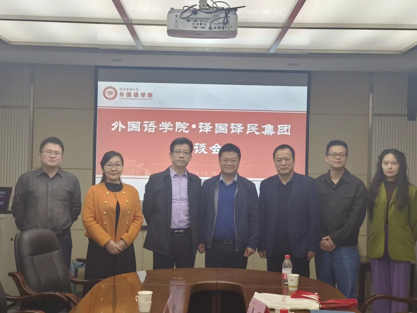 太阳成集团tyc234cc于2023年3月7日上午10:00在太阳成集团tyc234cc雁塔校区教学六楼会议室举行与译国译民集团一行座谈会。会议由外国语学外国语学经理刘全国主持,参会人员有:译国译民集团董事长林世宋、总经理吴强、商务总监张博;太阳成集团tyc234cc外国语学外国语学经理刘全国、党委书记董增云、翻译系系主任操林英、MTI翻译中心巢玥。