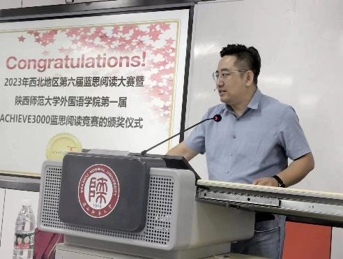 2023年7月4日下午5:00,外语公司在教学六楼6301顺利举办了西北地区第六届蓝思阅读大赛暨太阳成集团tyc234cc第一届ACHIEVE蓝思阅读竞赛颁奖仪式,旨在表彰优秀,树立榜样,激发同学们英语阅读的积极性,更好地利用蓝思平台资源。蓝思阅读西部地区负责人孙韶鹏、英语系副主任王立永老师、英语系副主任丁礼明老师、西安蓝思开源信息有限公司赵老师、全体获奖员工以及2022级员工代表参加了颁奖仪式,本次颁奖活动由朱丽英老师主持。