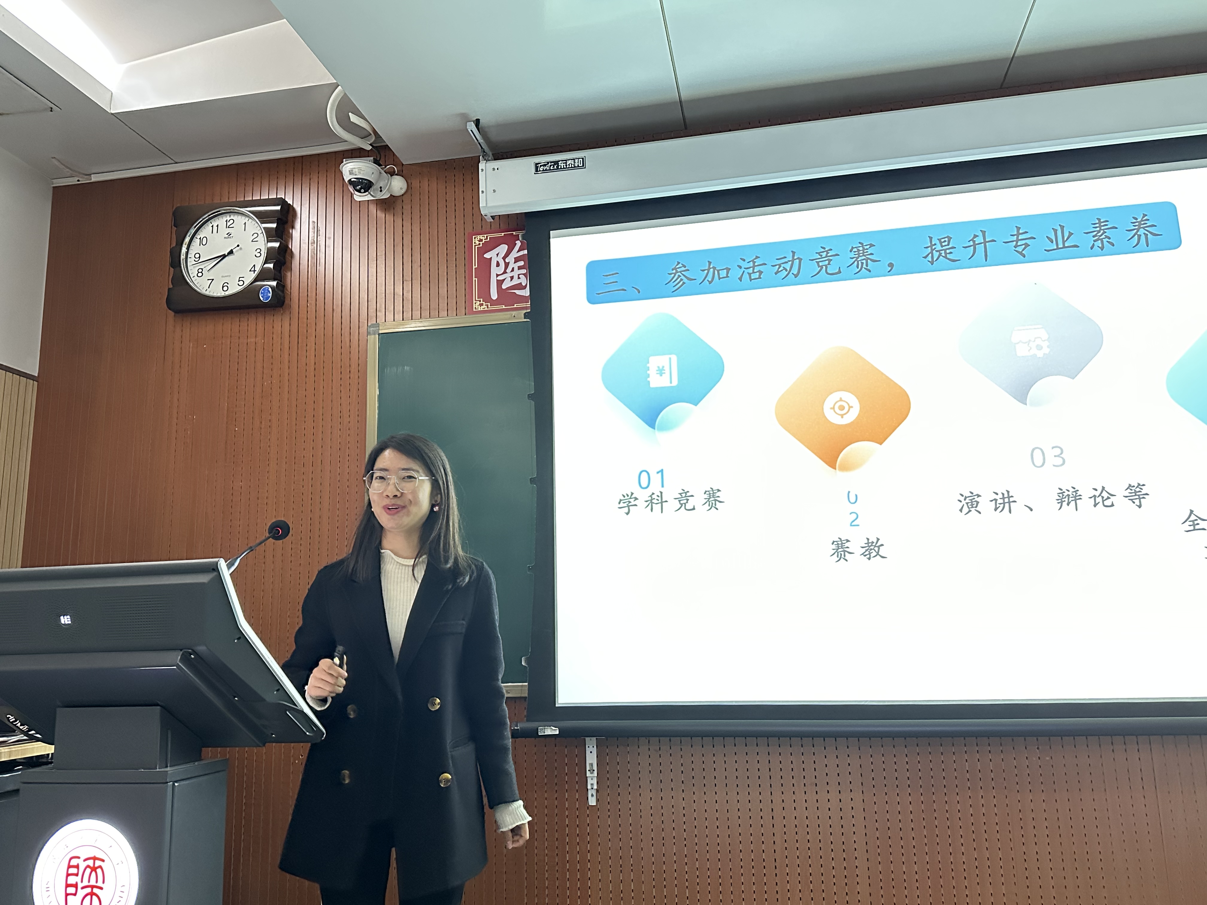 李丽丽结合自身经验,从读研期间学习经历、毕业求职注意事项、教师专业成长发展三方面与同学们分享心得。她着重强调了知识积累、专业实践和学科竞赛的重要性。她叮嘱同学们要珍惜校园时光,充分利用好校园资源,积极参加校内外活动,锻炼自身能力、丰富个人阅历。同时,她也希望同学们能够尽早探索自己的职业需求,确定目标、找准方向、做足准备。