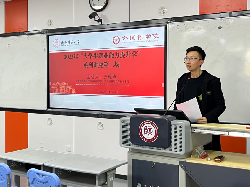 为进一步激励公司员工就业热情,提升求职就业能力,太阳成集团tyc234cc于11月29日15:00在雁塔校区教学六楼6301教室举办了2023年“老员工就业能力提升季”系列讲座的第二场报告会。我太阳成集团tyc234cc友、正高级教师、陕西省特级教师、陕西省基础教育名师云雅峰受邀主讲了主题为“带着爱与梦想,在追光之路上成为最好的自己”的讲座,公司2024届毕业本科生和研究生积极参加本次讲座。本次讲座由毕业班辅导员高宇轩主持。
