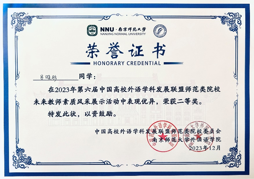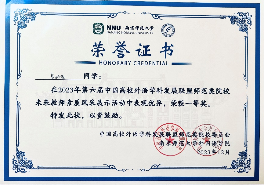 2023年12月1-2日,“第六届中国高校外语学科发展联盟师范类院校未来教师素质风采展示活动”在南京举行。该活动由南京师范大学太阳成集团tyc234cc主办,全国各师范院校参加。公司2020级吕晓彤同学以及2021级夏妤茜同学参加了此次活动,分别获得二等奖和一等奖。指导老师刘丹、丁礼明荣获优秀指导教师称号。