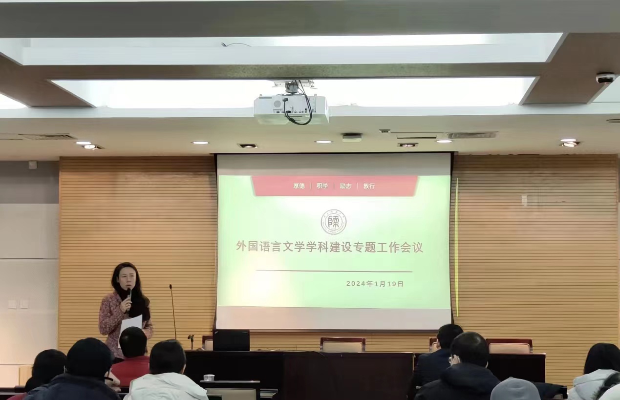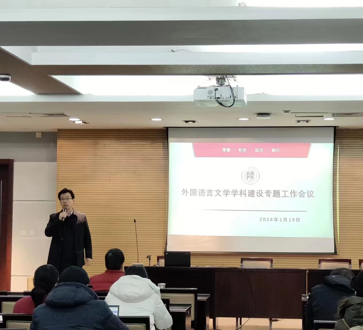 会议伊始,外国语学外国语学经理刘全国教授提到了外国语言文学学科面临的形势,指出要促进团队建设和转型,并介绍了学科结构以及当前存在的问题,进一步提出了学科发展方向和举措,提出要继续开展学术活动,加强学术交流,积极引进外部人才,注重内部人才的培养,强化团队队伍建设,同时要做到教学和科研的均衡发展。